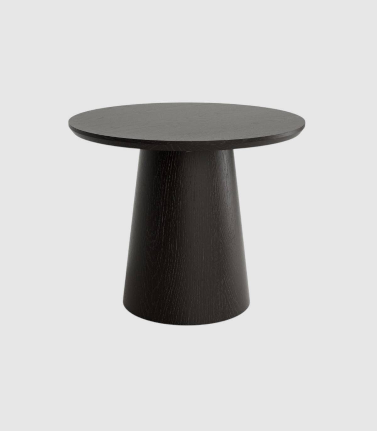 La mesa Namib de centro redonda se compone de tablero de madera biselado en acabado de madera de roble sobre pata central de madera en forma de cono.