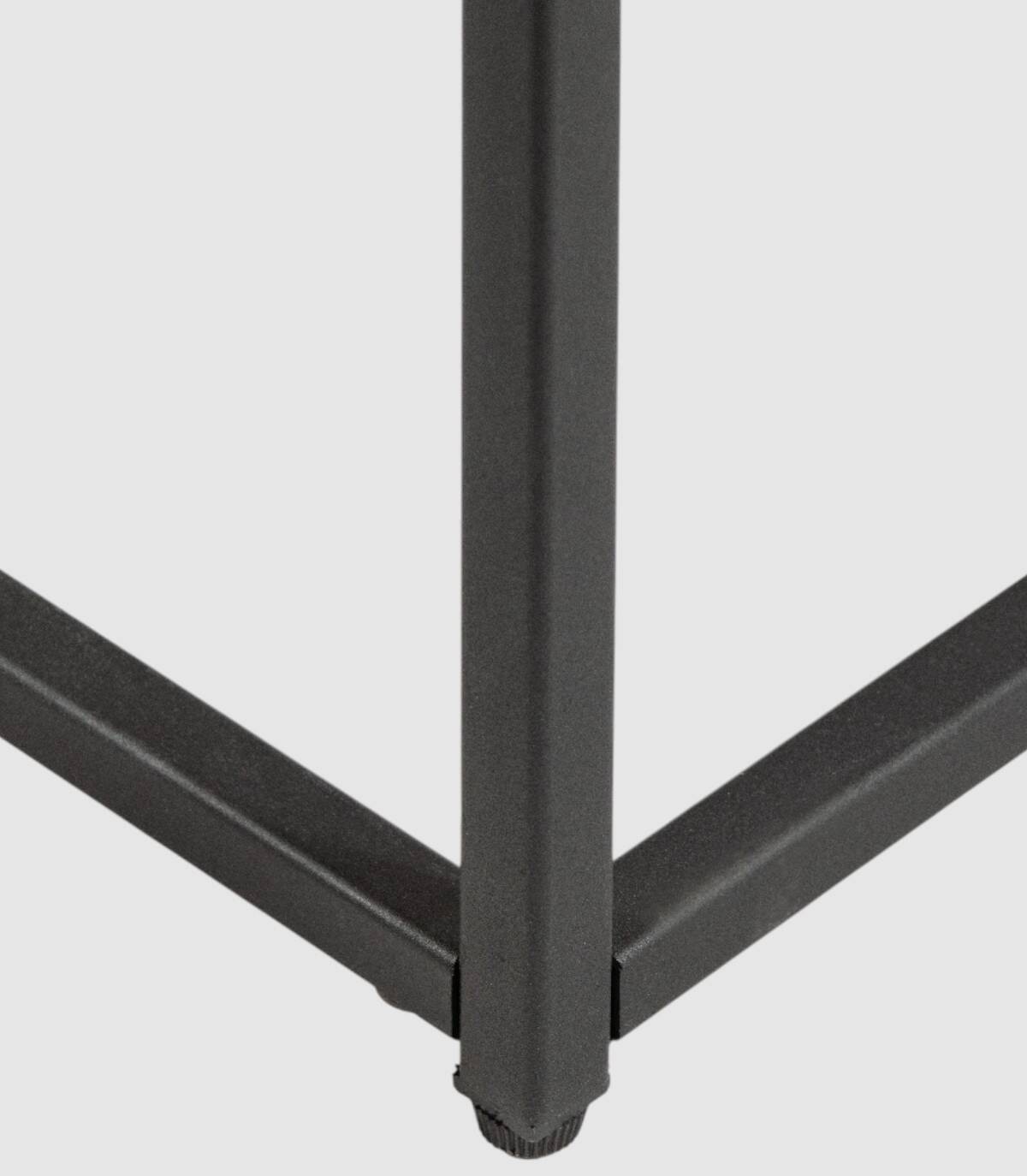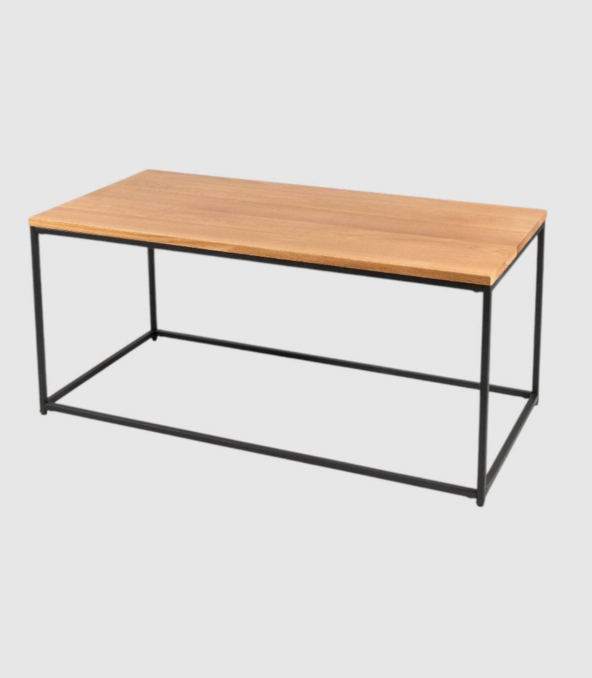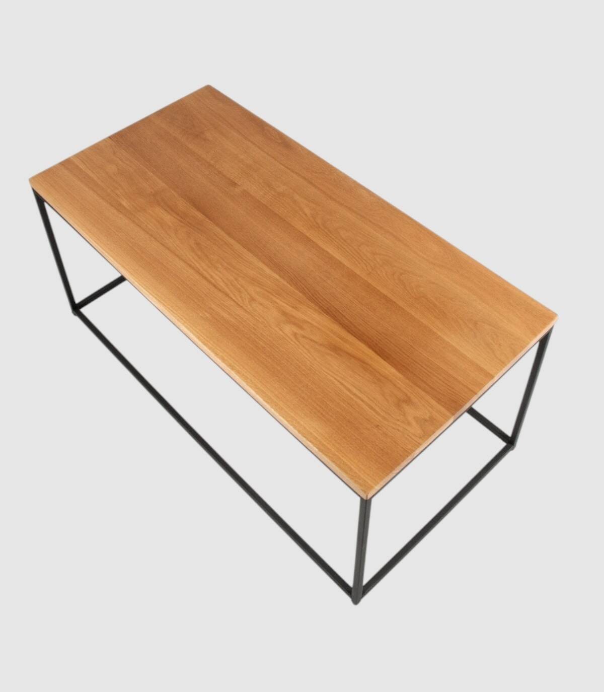 La mesa Austral de centro rectangular se compone de tablero de madera de roble sobre estructura cubica metálica pintada de color negro con forma de cuatro patas unidas por los extremos.