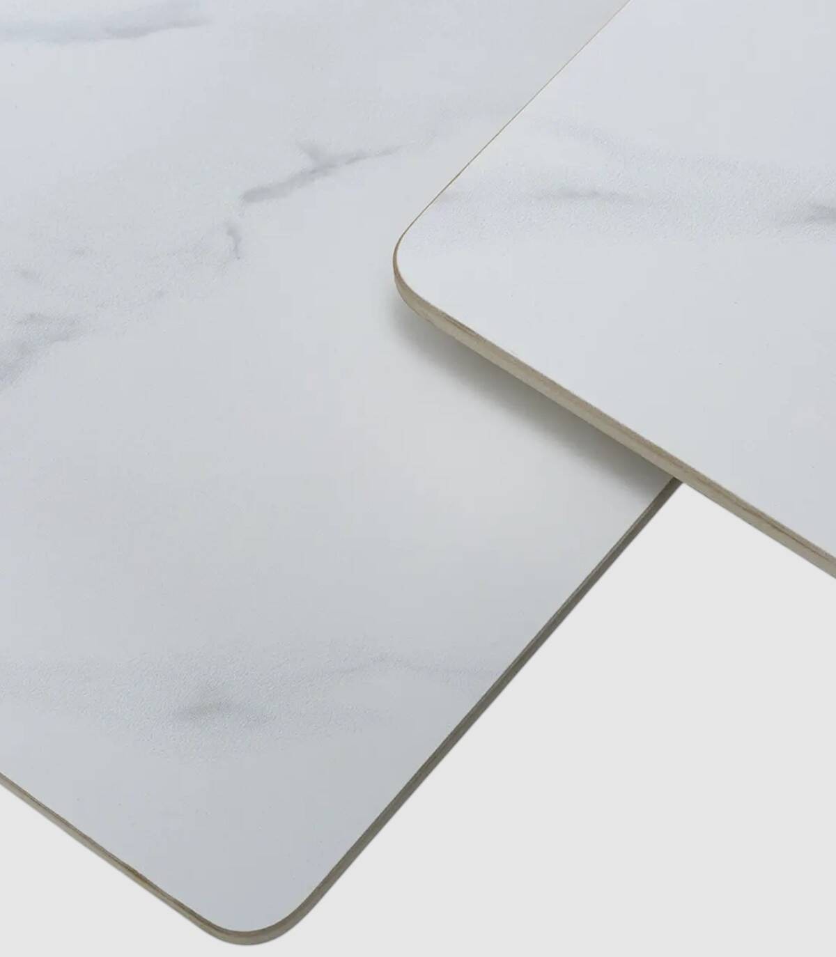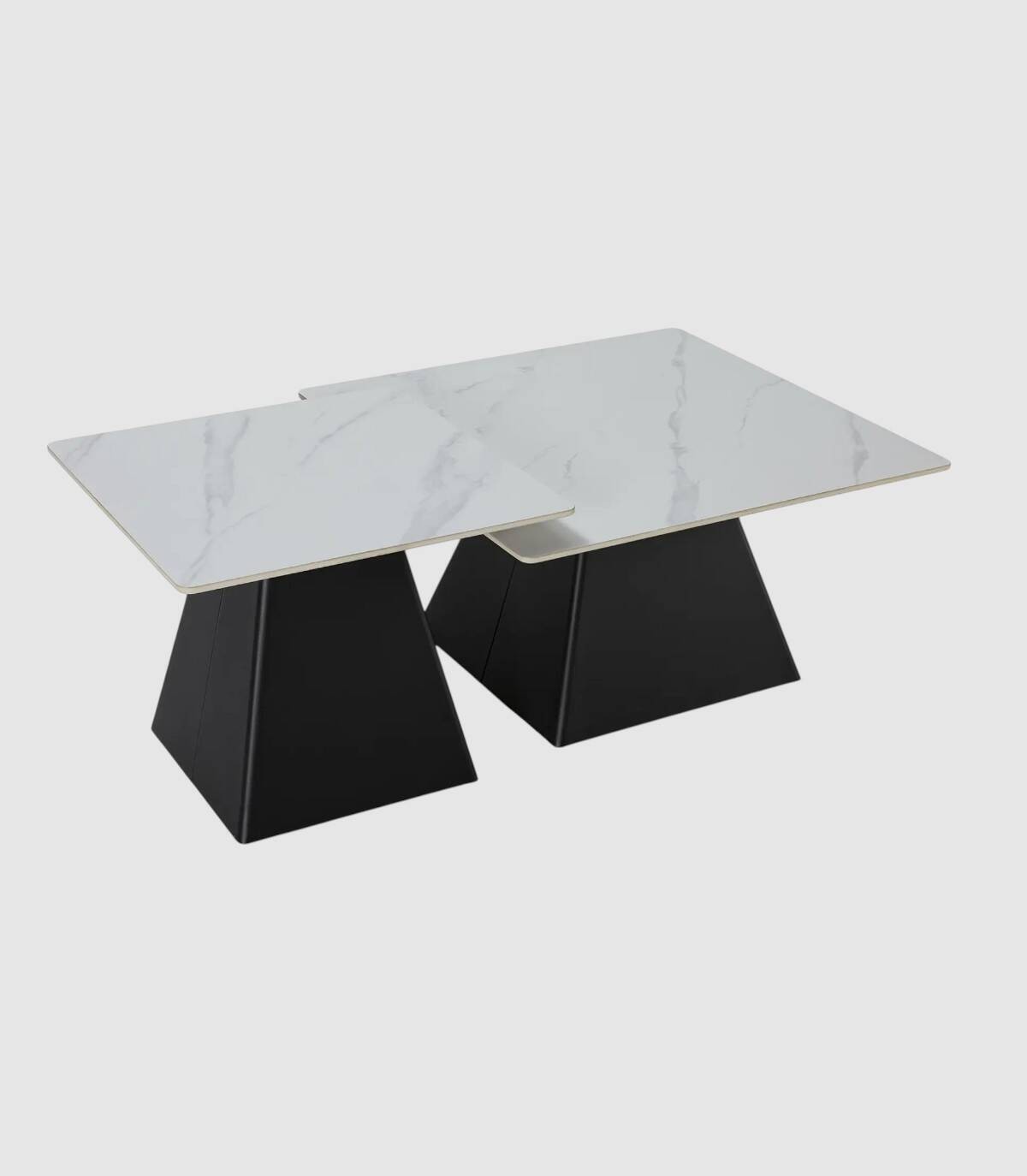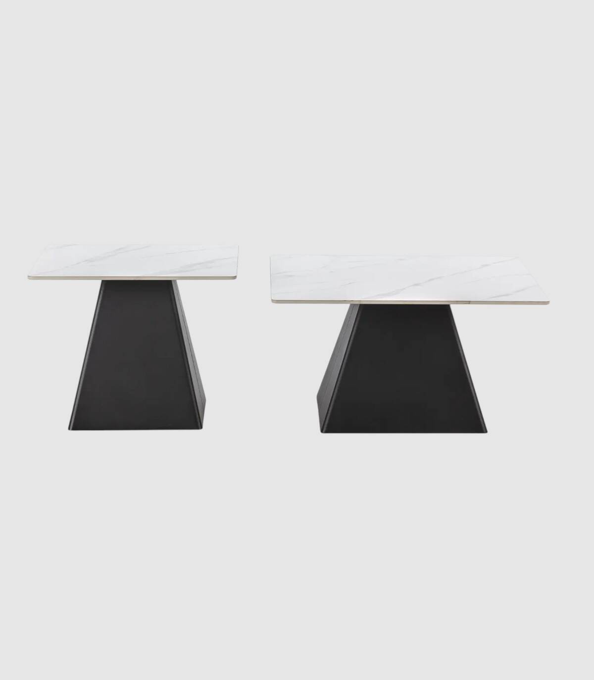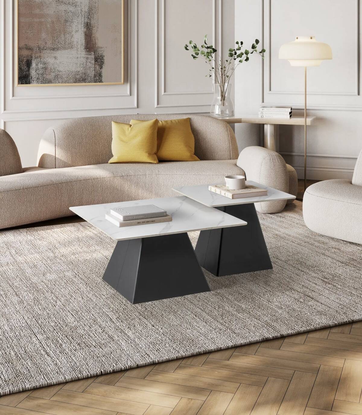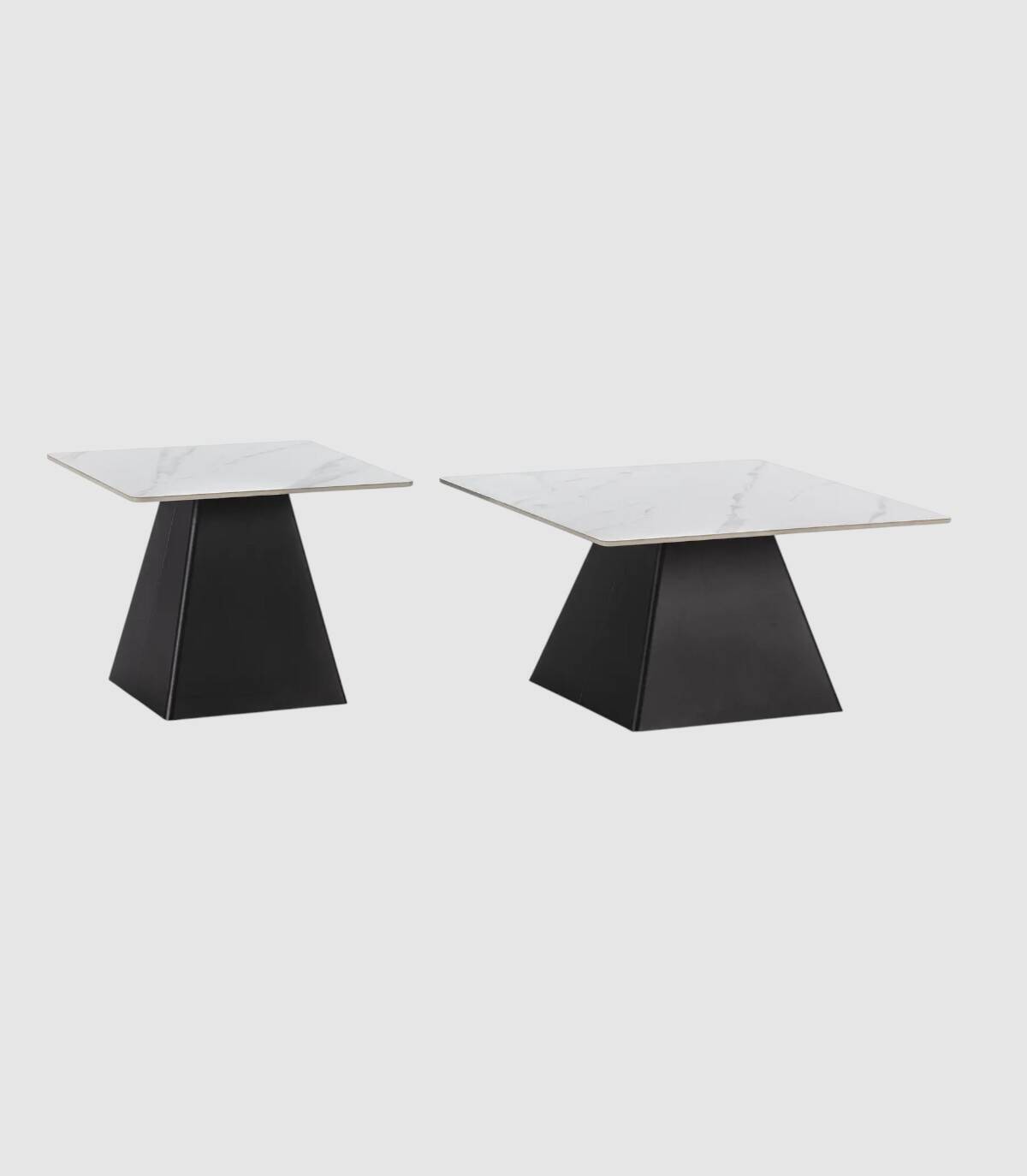La mesa de centro Nuske se compone de tablero cuadrado de piedra sinterizada sobre un pie de metal de color negro.