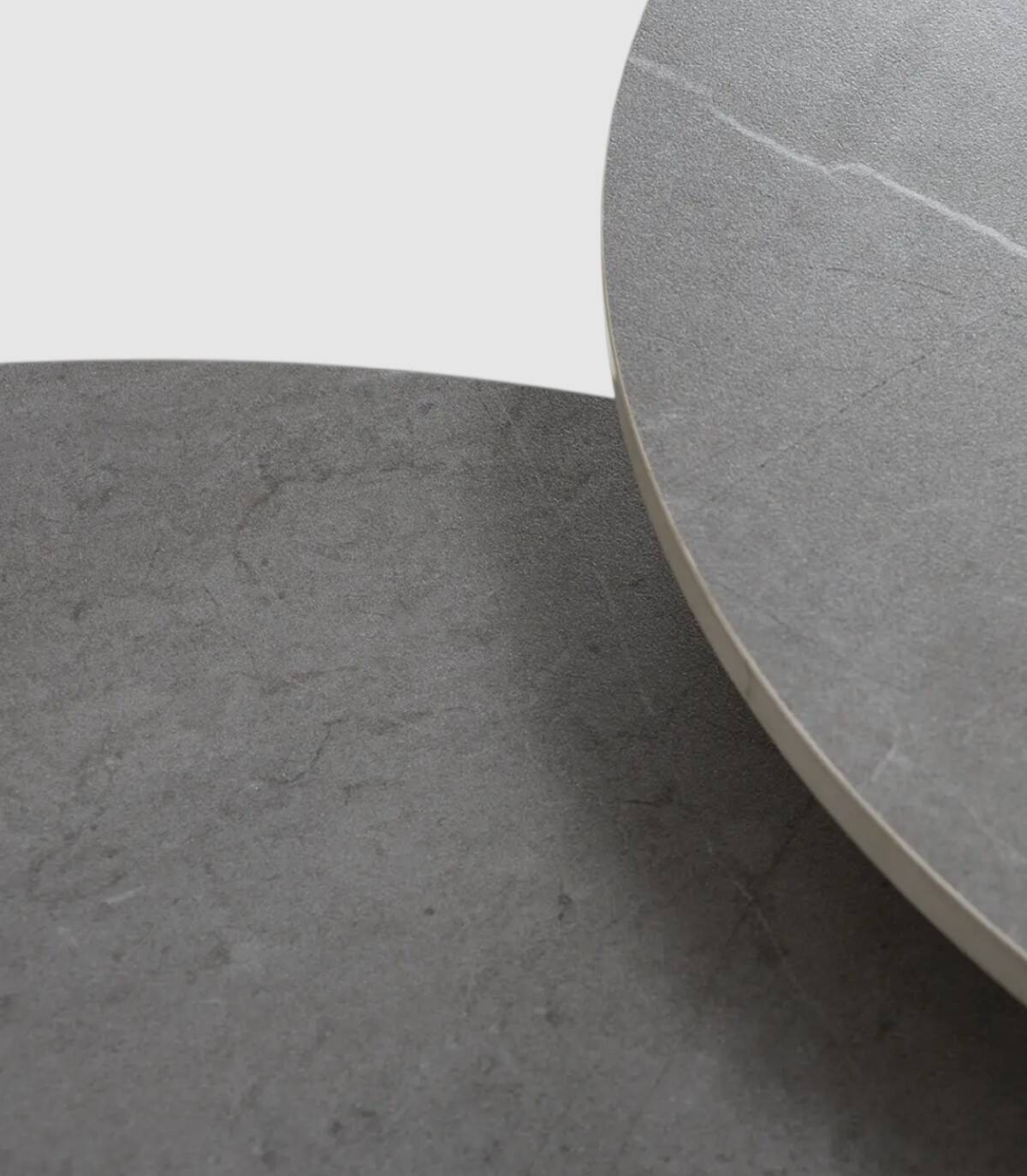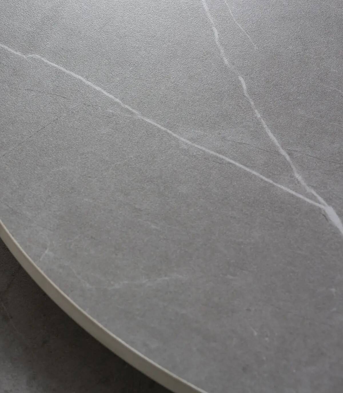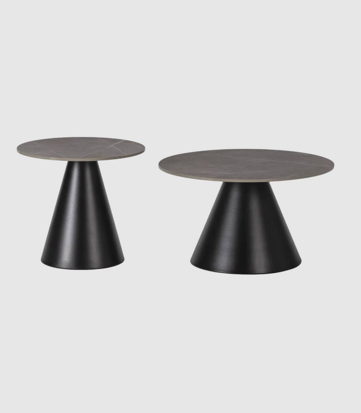 La mesa de centro Tartu se compone de tablero redondo de piedra sinterizada de color gris sobre una pata central de metal pintado de color negro.