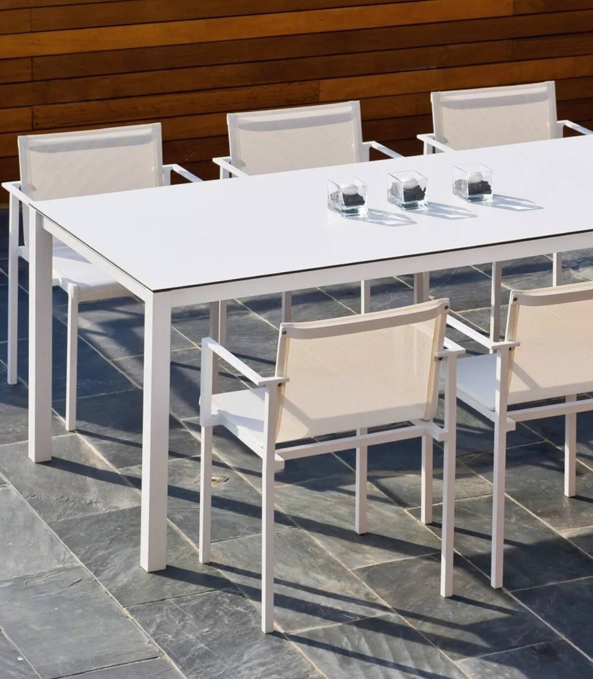 La mesa de comedor Una está fabricada en aluminio con revestimiento en polvo (poliéster). Tiene una superficie rectangular lisa de cristal. Las 4 patas tienen tapones antideslizantes.