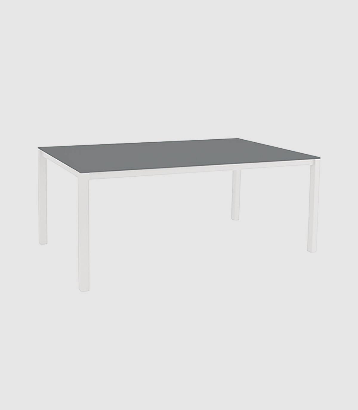 La mesa de comedor Una está fabricada en aluminio con revestimiento en polvo (poliéster). Tiene una superficie rectangular lisa de cristal. Las 4 patas tienen tapones antideslizantes.