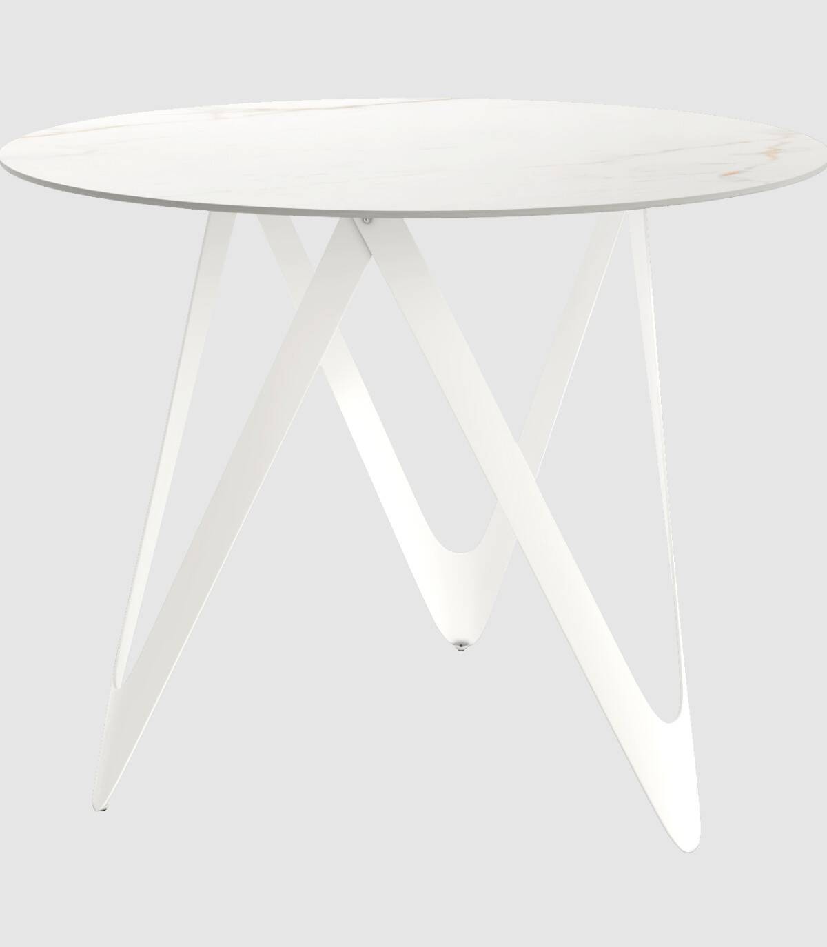 La mesa Mar redonda, de diseño elegante y moderno, tiene sobre de cerámica y estructura de metal con barnizado negro.