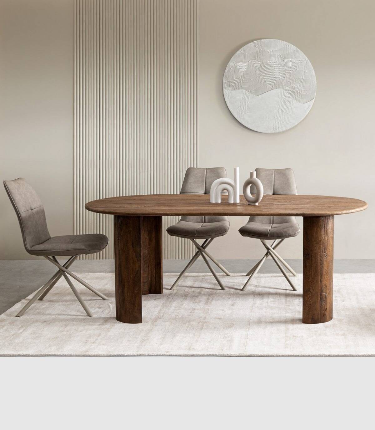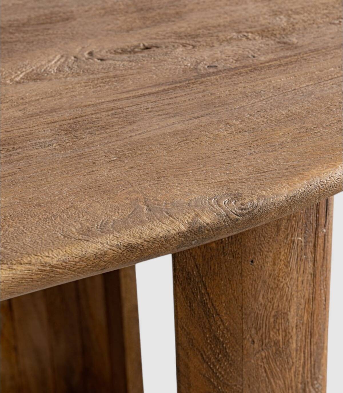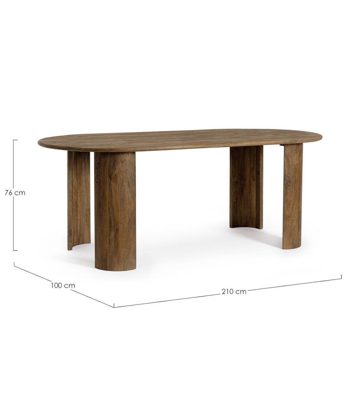 La mesa Orlando se compone de un tablero ovalado y cuatro patas (requieren montaje) con forma redondeada de madera de mango. Acabado a base de nitrocelulosa.