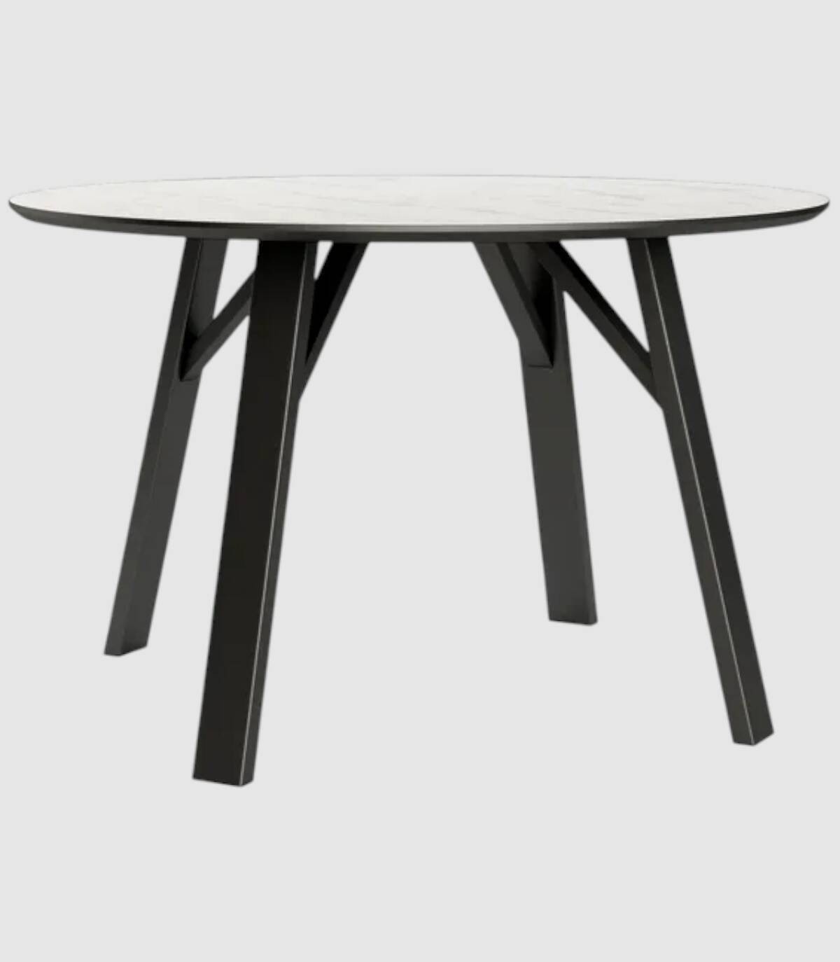 La mesa Baltic redonda, de diseño elegante y moderno, tiene sobre biselado con acabado estilo piedra y estructura de metal con barnizado negro.