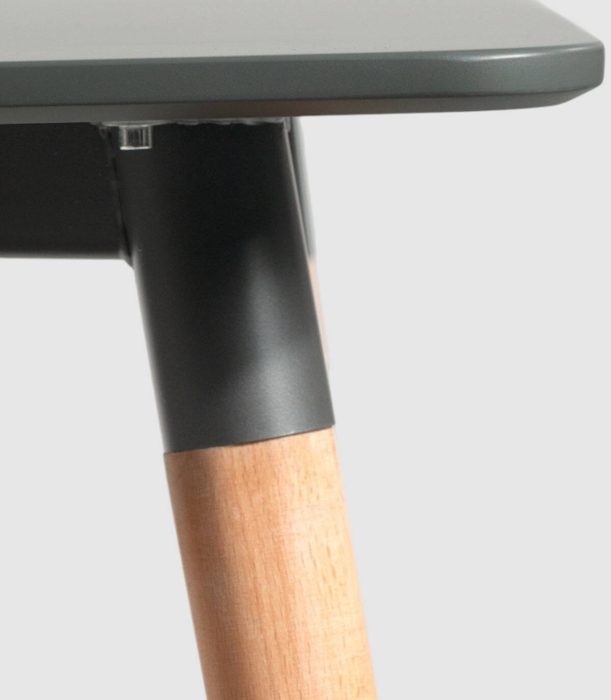 La mesa Caribe cuadrada, de diseño elegante y moderno, tiene sobre de MDF lacado y patas de madera de color natural con regulación en la base.