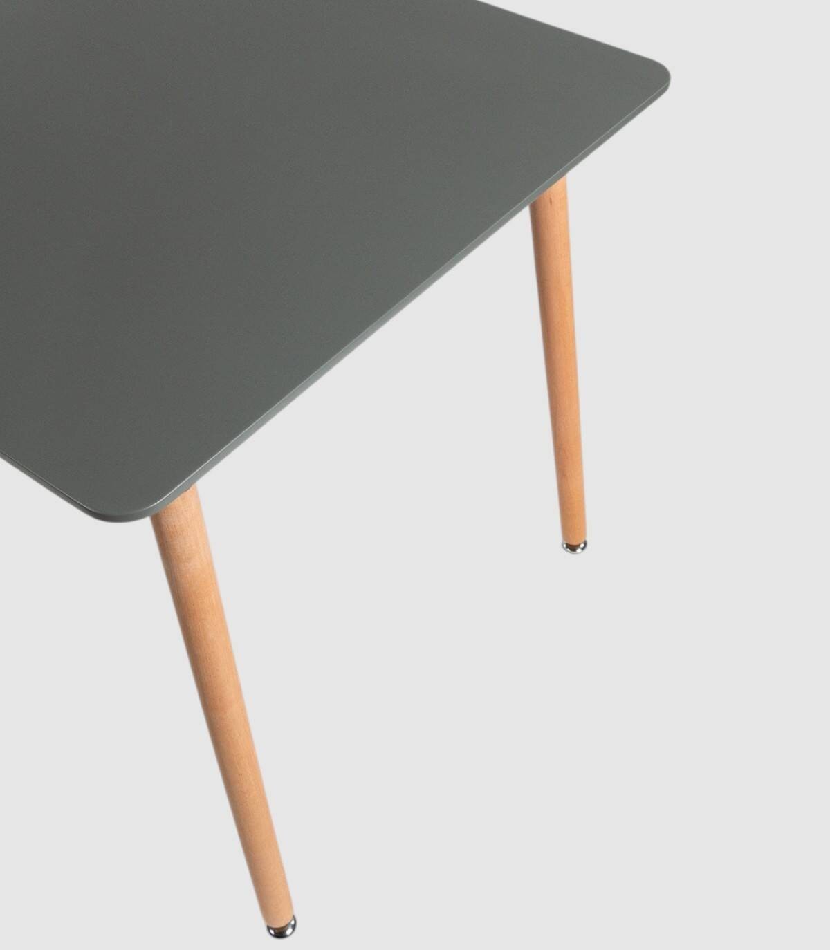 La mesa Caribe rectangular, de diseño elegante y moderno, tiene sobre de MDF lacado y patas de madera de color natural con regulación en la base.