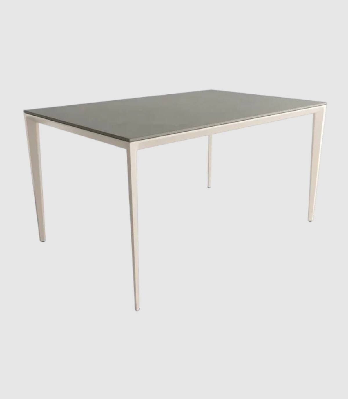 La mesa Cortés rectangular se compone de estructura y patas de color marfil con tablero de porcelana de color porland.