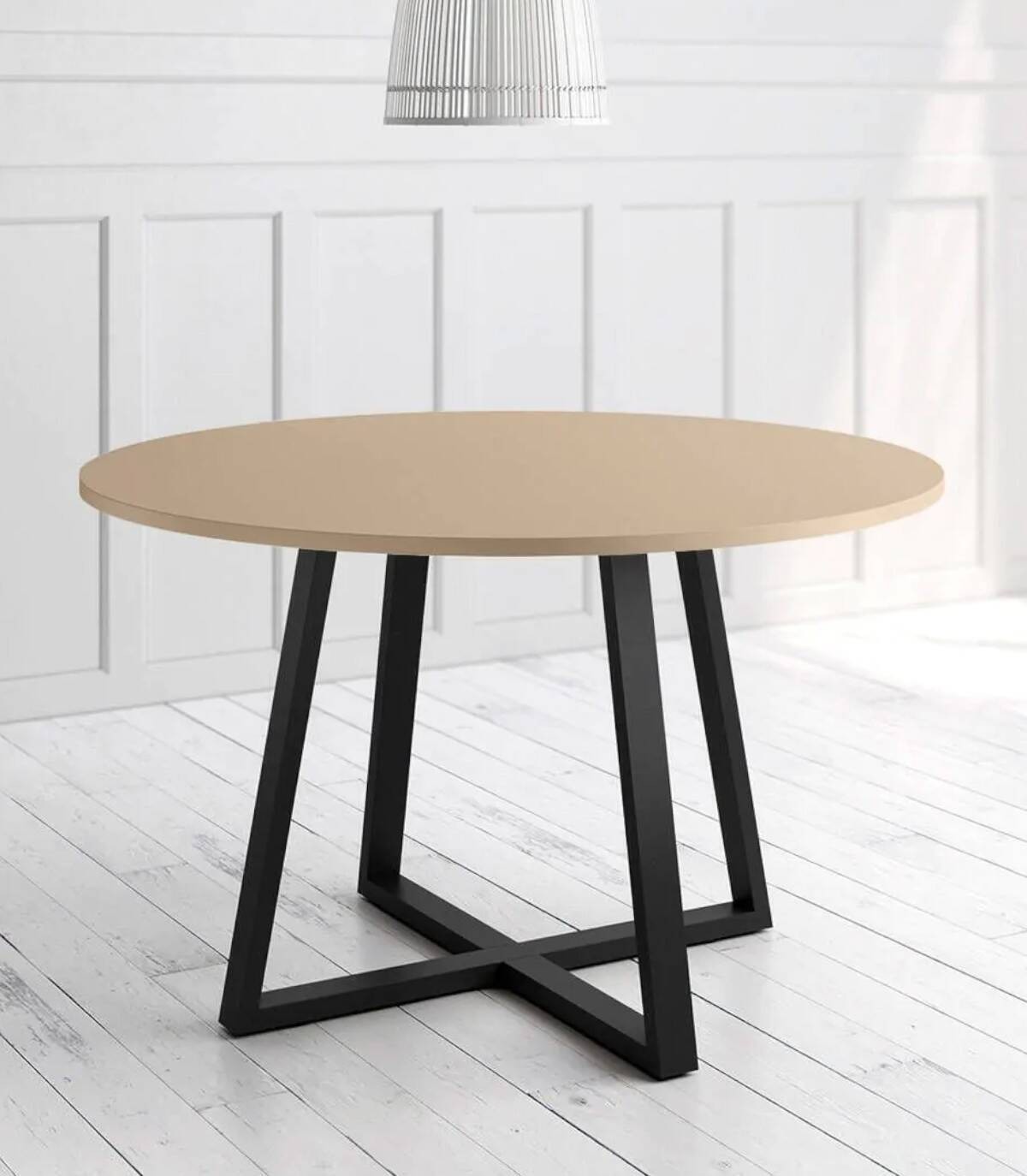 La mesa Lugano redonda se compone de estructura y patas de color negro con tablero de melamina de color perla.