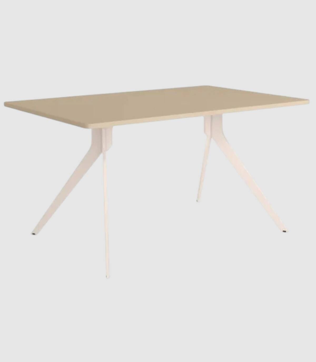 La mesa Iseo de comedor rectangular fija se compone de tablero con esquinas redondeadas con acabado de melaminas sobre estructura metálica pintada de color marfil, con diseño de cuatro patas diagonales.