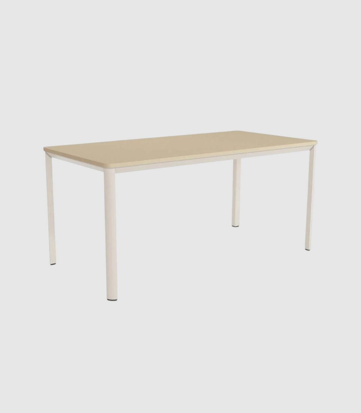 La mesa Onea de comedor rectangular fija se compone de tablero con esquinas redondeadas con acabado de melaminas sobre estructura metálica de cuatro patas pintada de color marfil.