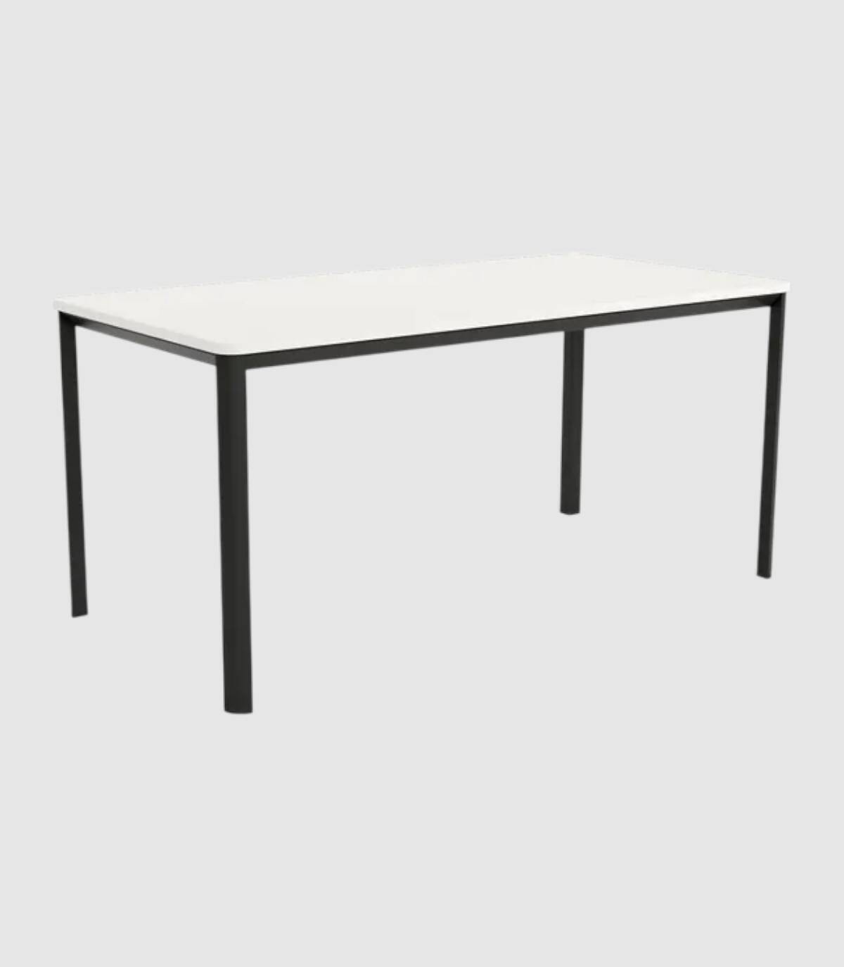 La mesa Onea de comedor rectangular fija se compone de tablero con esquinas redondeadas con acabado de melaminas sobre estructura metálica de cuatro patas pintada de color negro.