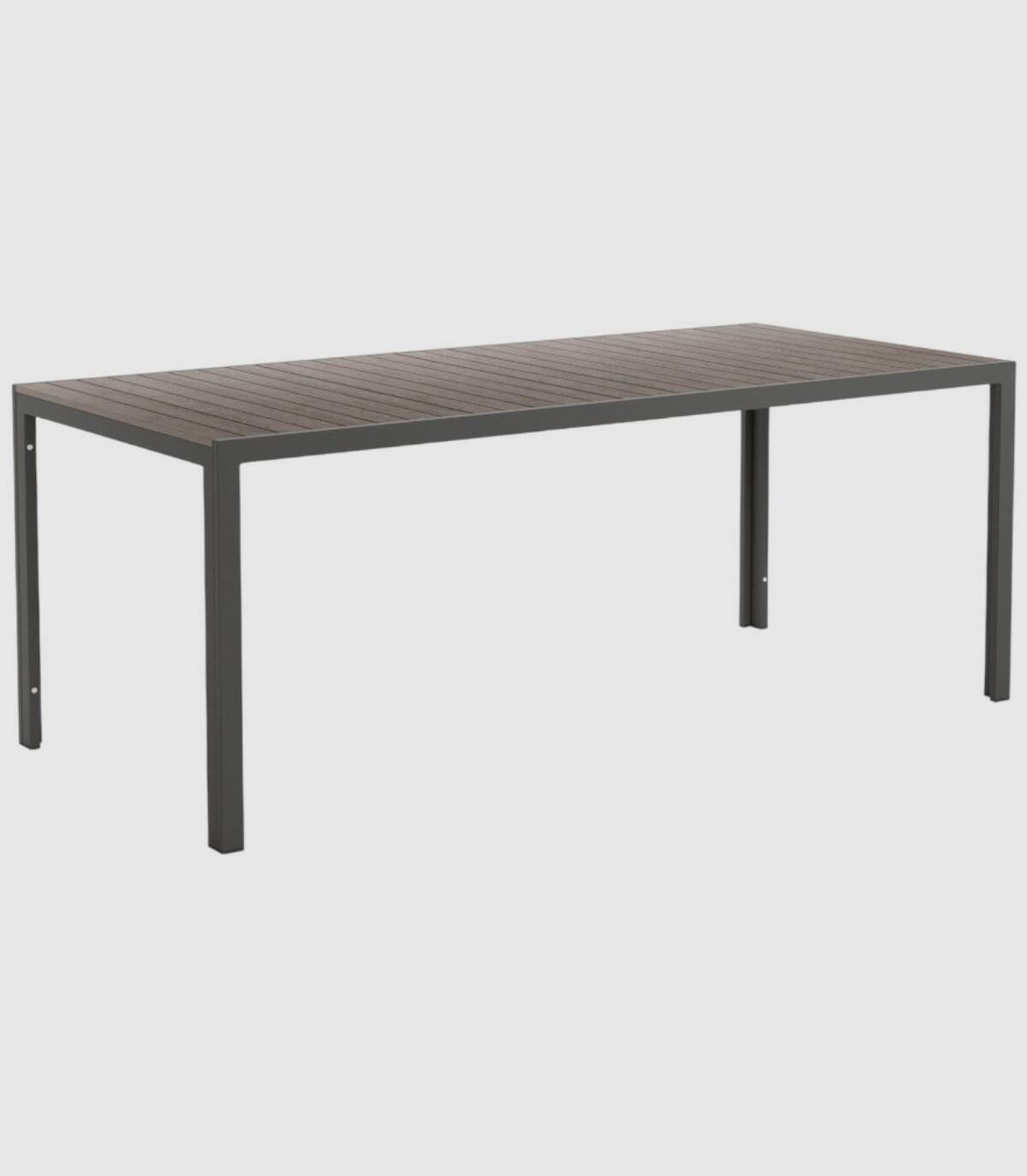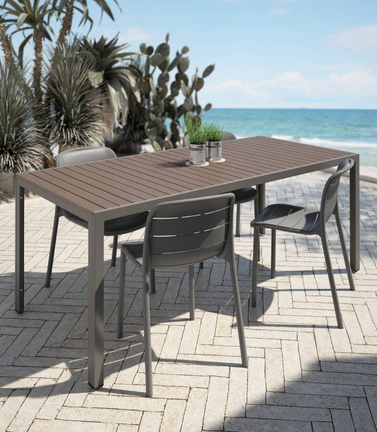 La mesa Marea de exterior se compone de tablero de lamas de WPC efecto madera sobre estructura metalica de cuatro patas pintadas de color grafito.