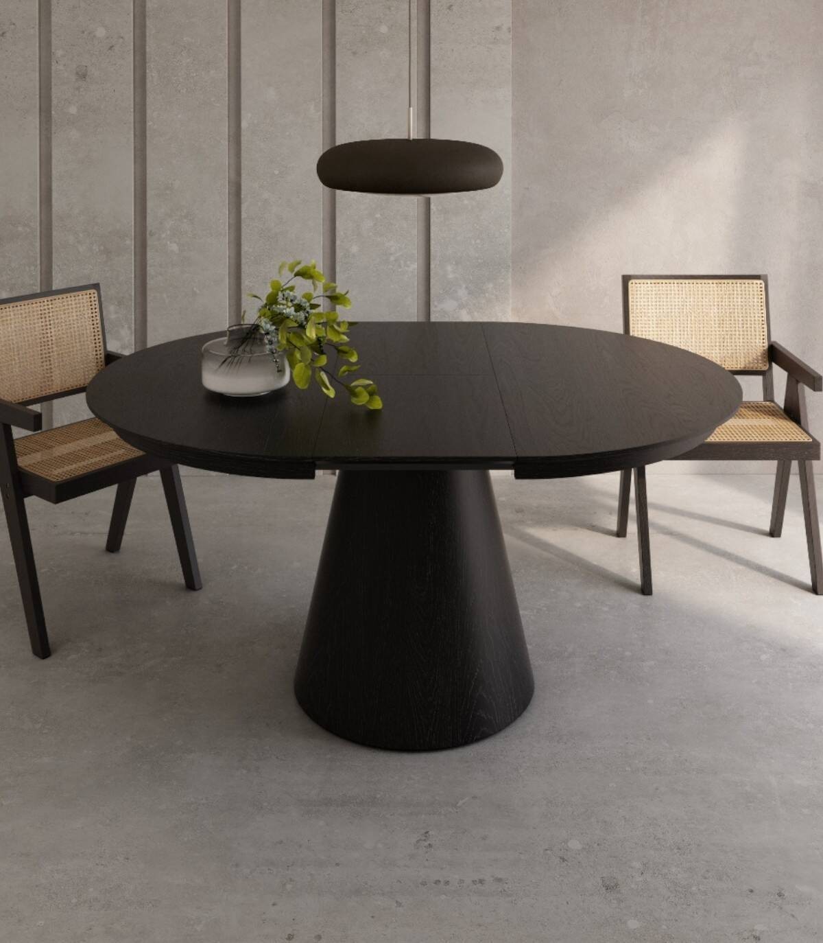 La mesa Namib de comedor redonda extensible se compone de tablero de madera biselado partido en dos partes sobre la extension con soporte central en forma de cono en acabado de madera de roble.