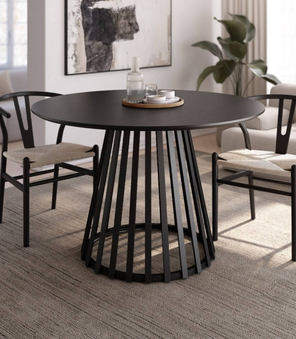 La mesa Sahara de comedor redonda fija se compone de tablero de madera biselado en acabado de madera de roble sobre soporte central metálico pintado de color negro en forma de barras verticales.