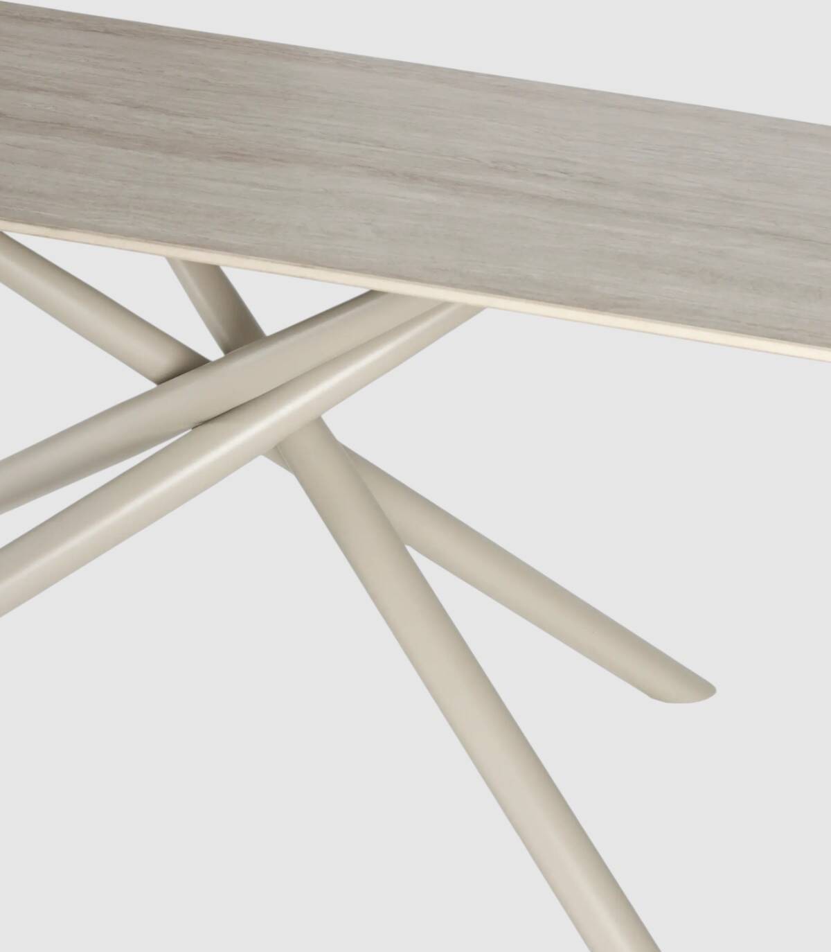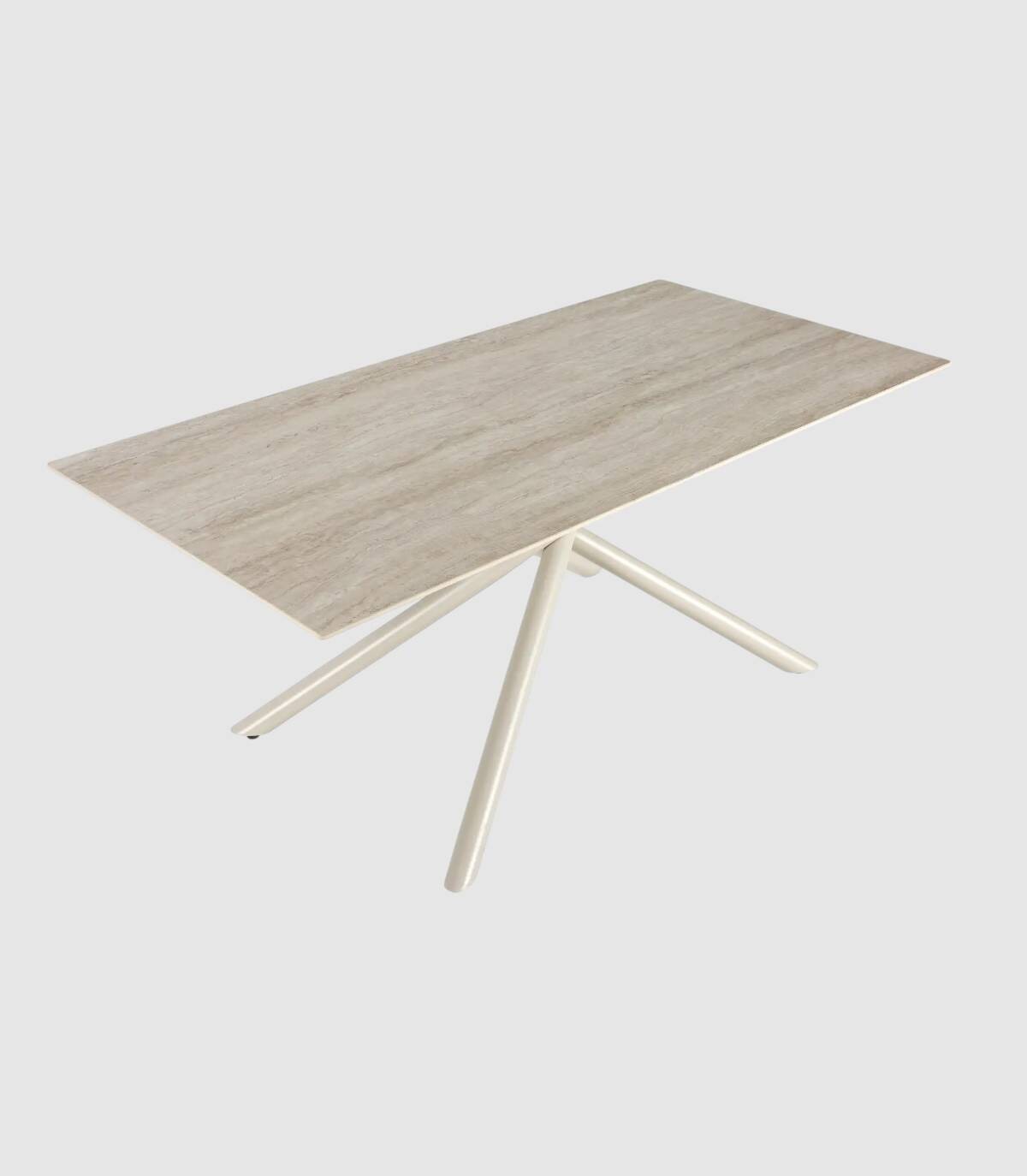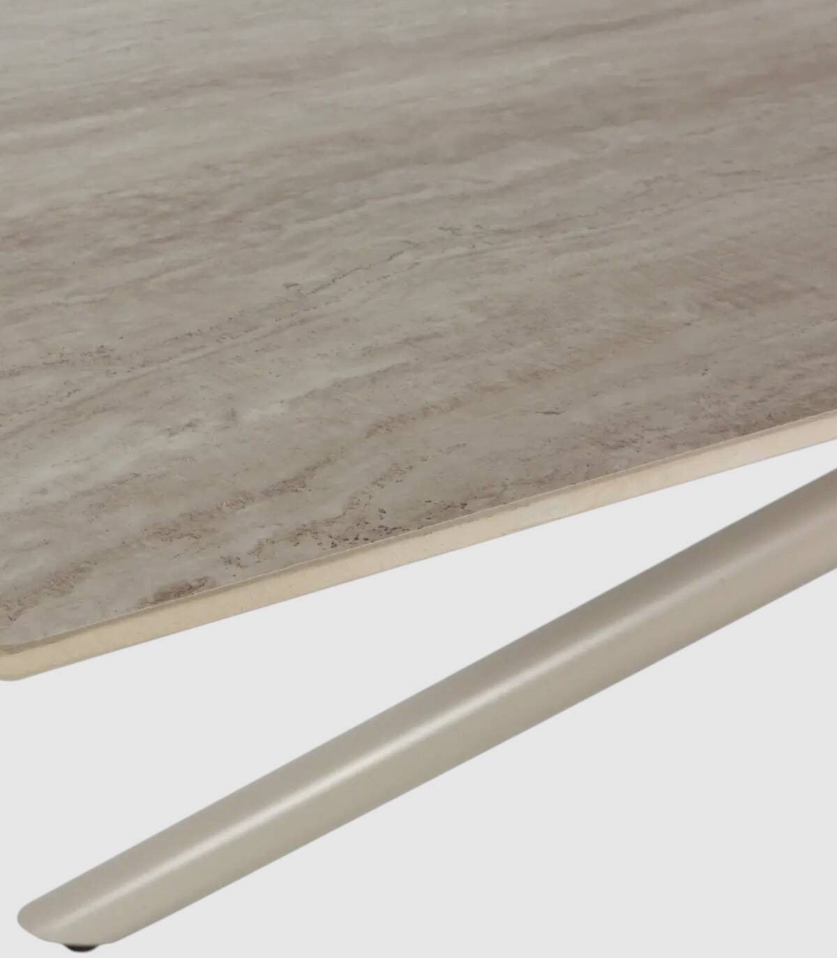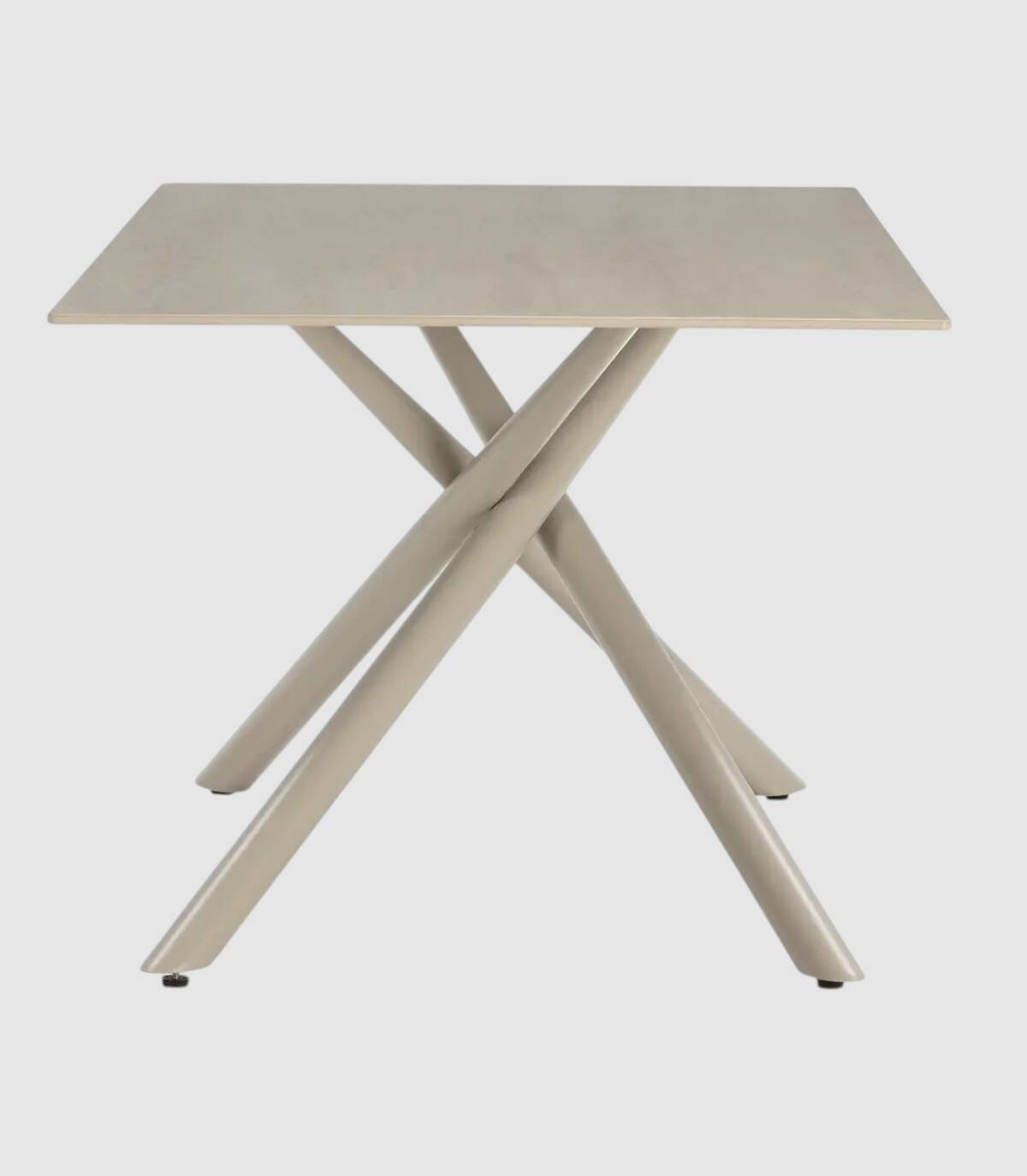 La mesa de comedor Danby se compone de tablero rectangular de cerámica de color beige sobre cuatro patas cilindricas cruzadas de metal de color crema.