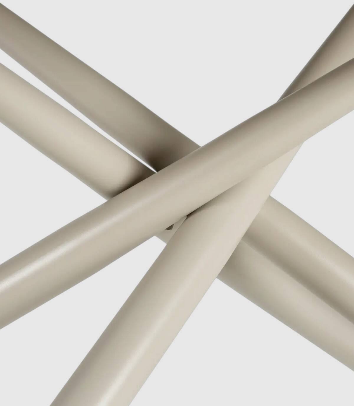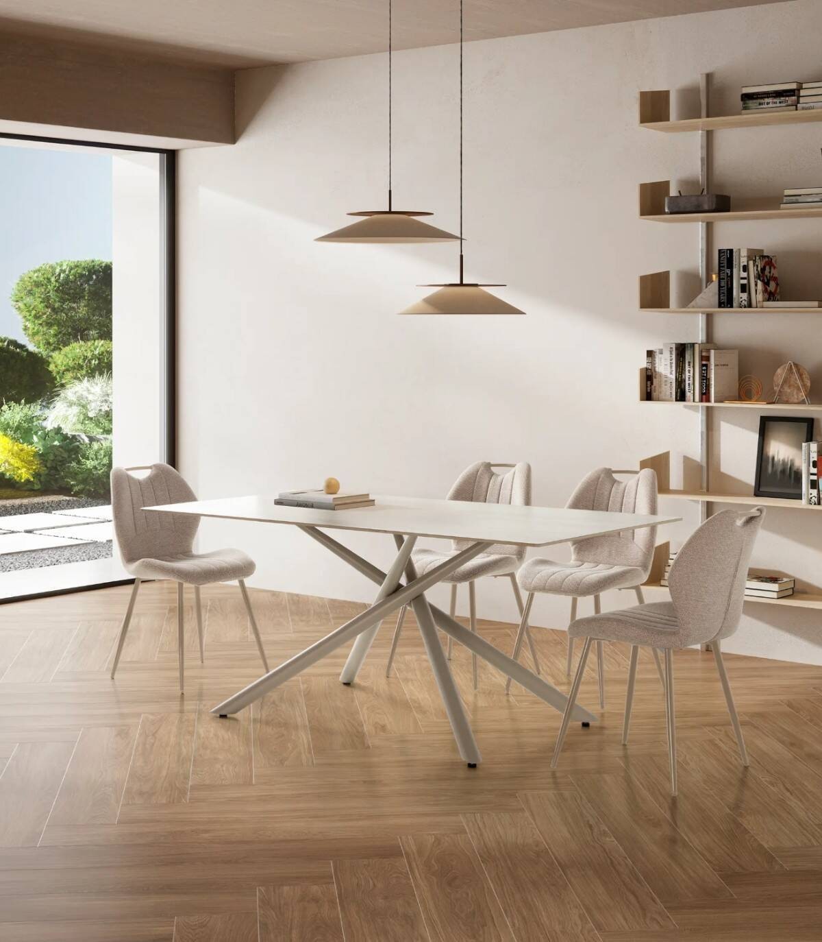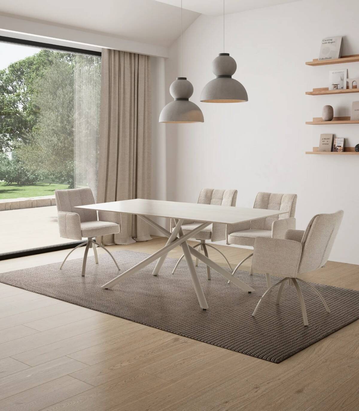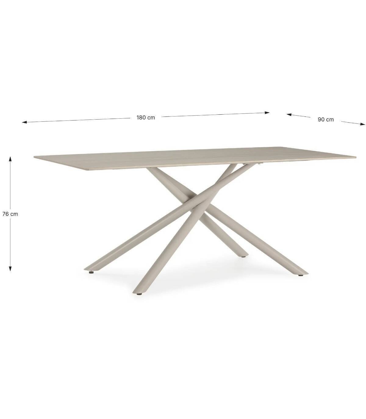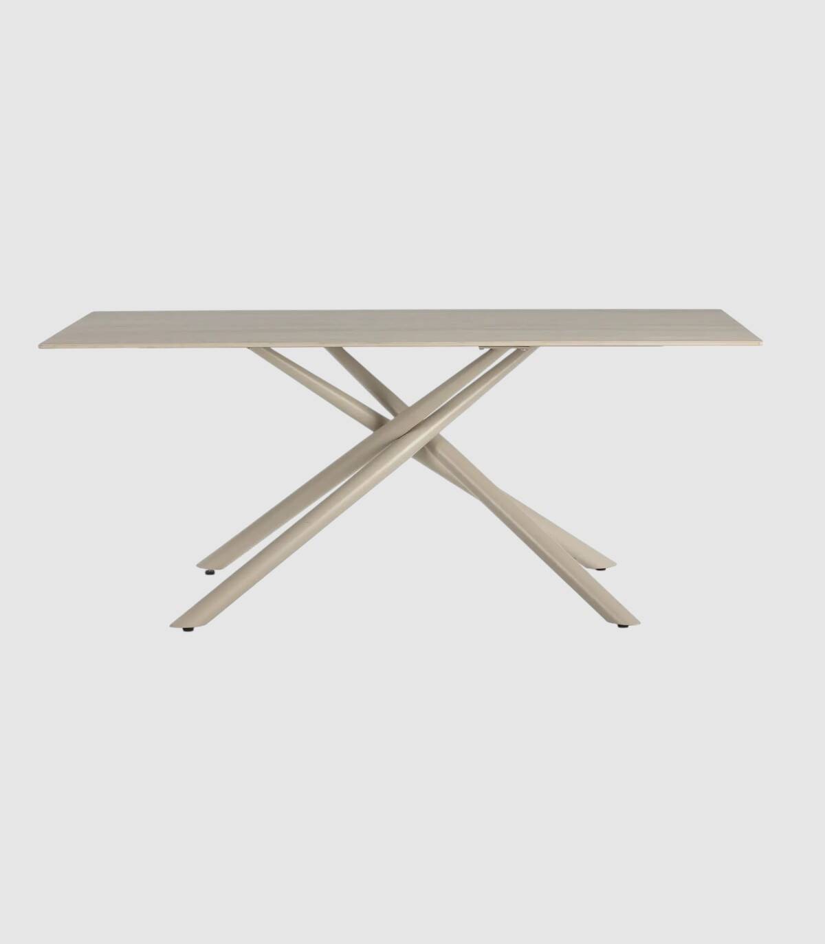 La mesa de comedor Danby se compone de tablero rectangular de cerámica de color beige sobre cuatro patas cilindricas cruzadas de metal de color crema.