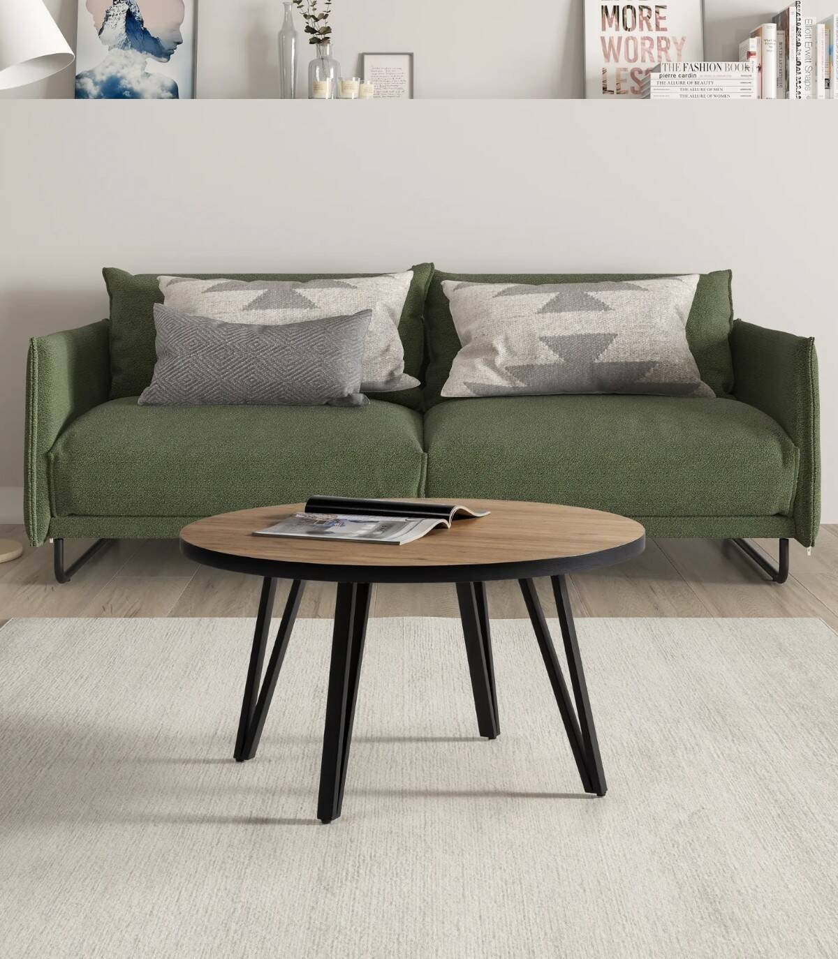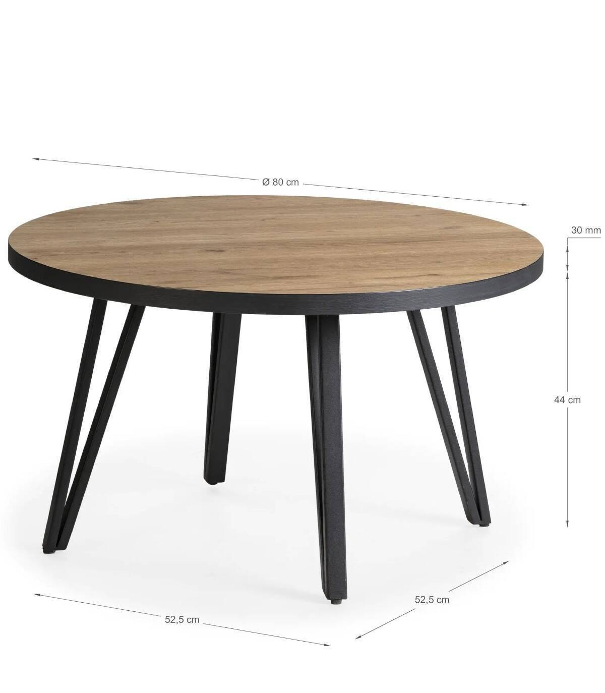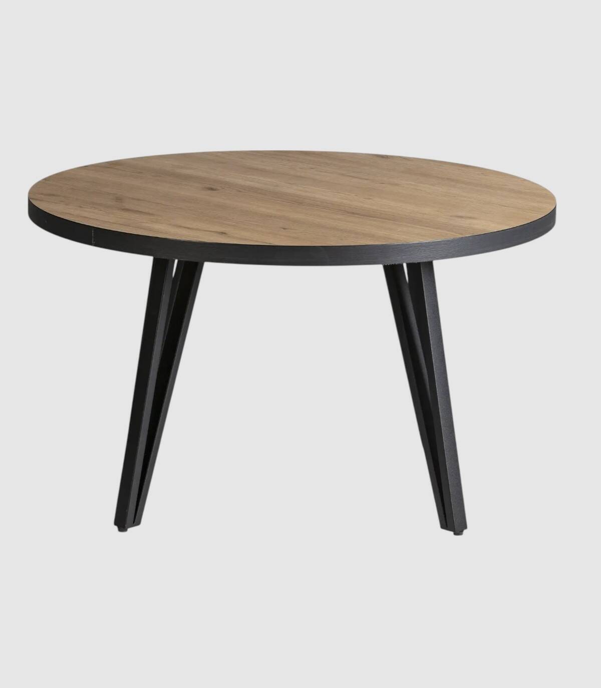La mesa de centro Kesir se compone de tablero redondo de melamina con canto de bocamina sobre cuatro patas en forma de v de metal de color negro.