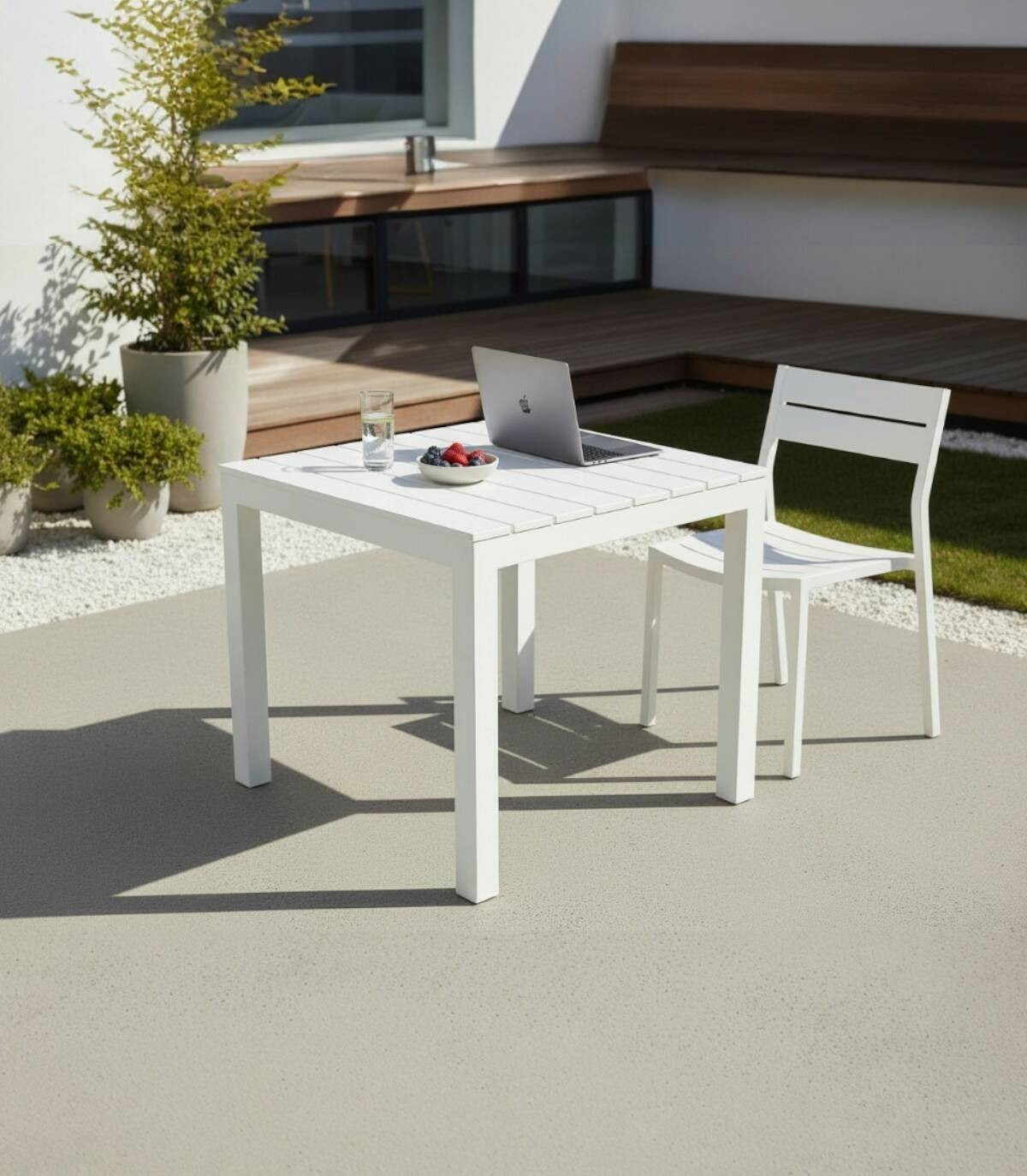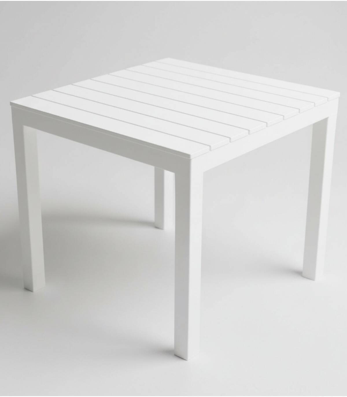 La mesa Bali cuadrada esta fabricada en polipropileno, tiene una superficie con perforaciones estilo listones.