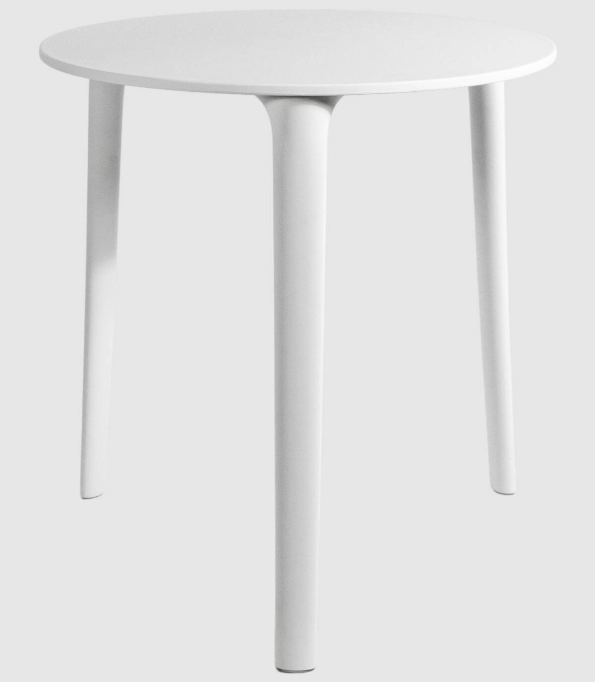 La mesa Sulu redonda, de diseño elegante y moderno, tiene sobre y patas de polipropileno del mismo color.