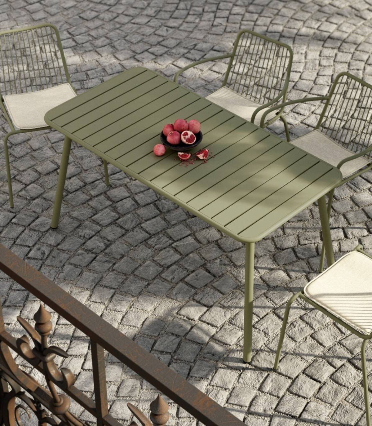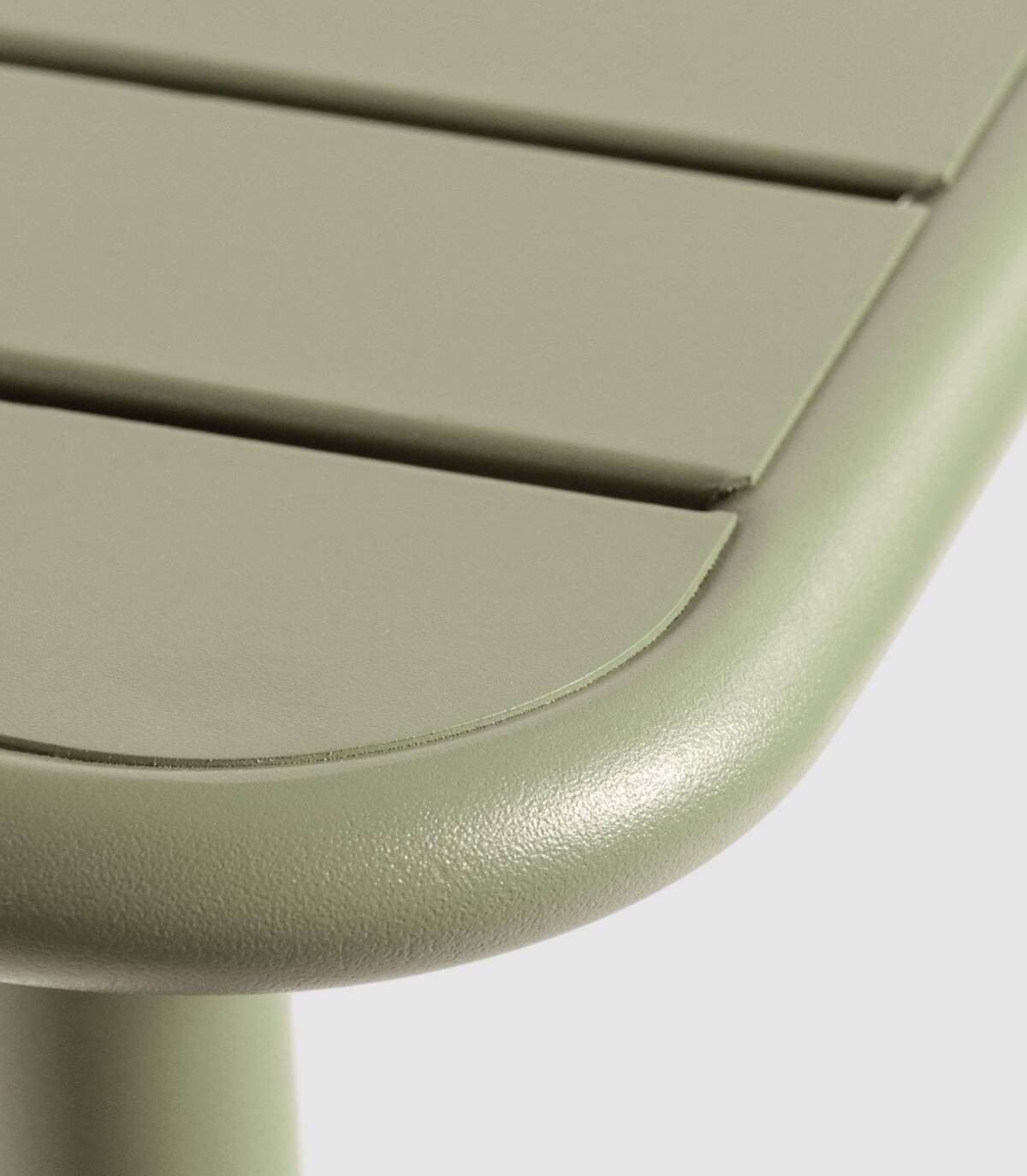 La mesa Honolulu de exterior se compone de tablero de lamas metálico sobre estructura metalica de cuatro patas pintadas del mismo color.