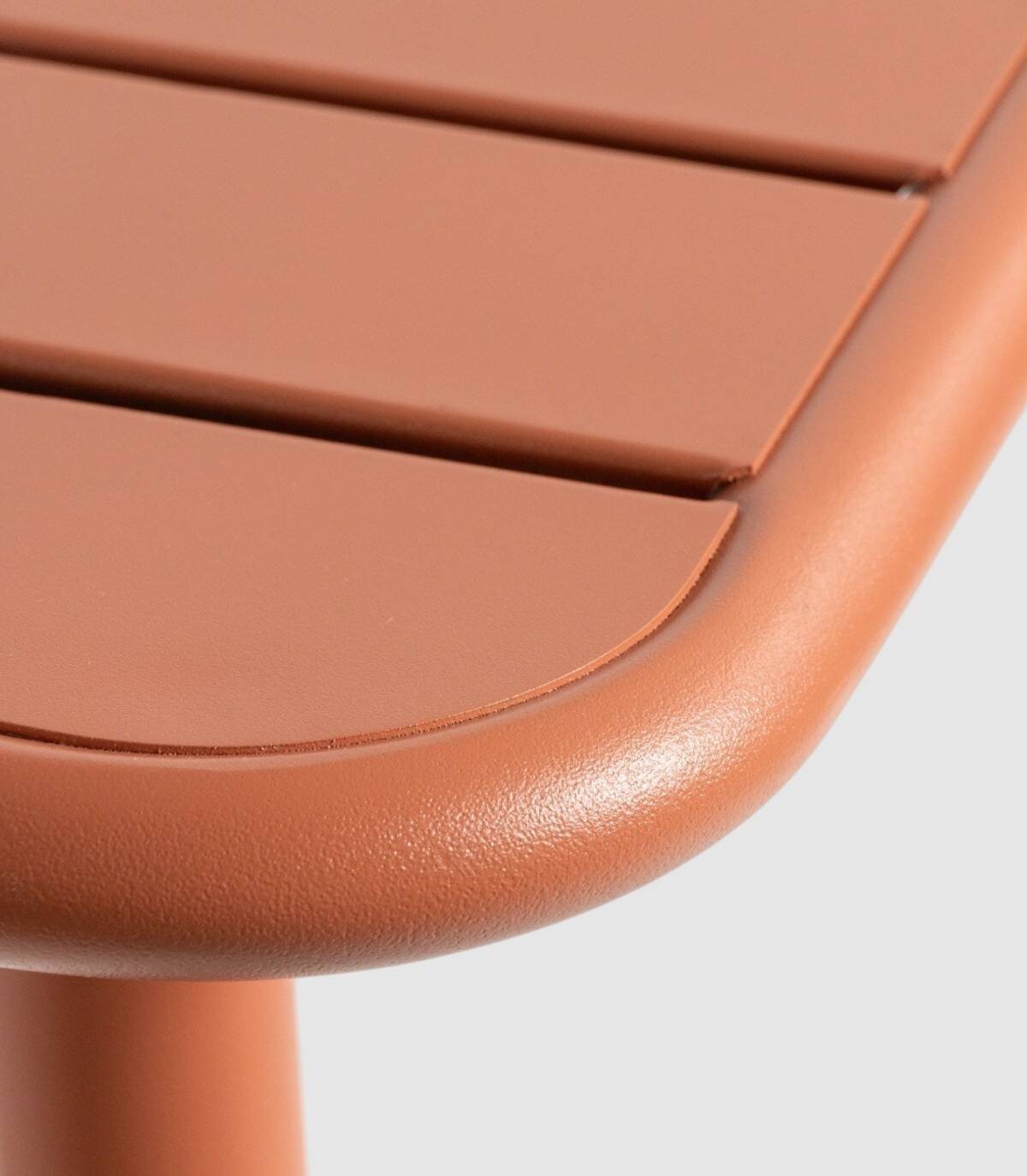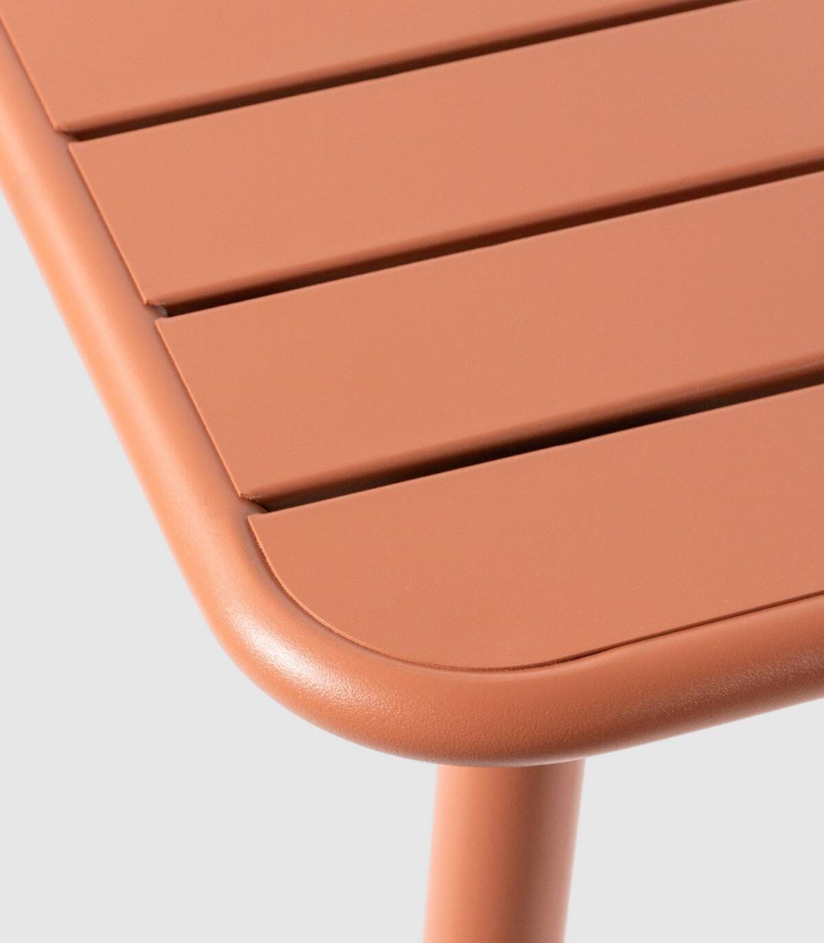 La mesa Honolulu de exterior se compone de tablero de lamas metálico sobre estructura metalica de cuatro patas pintadas del mismo color.