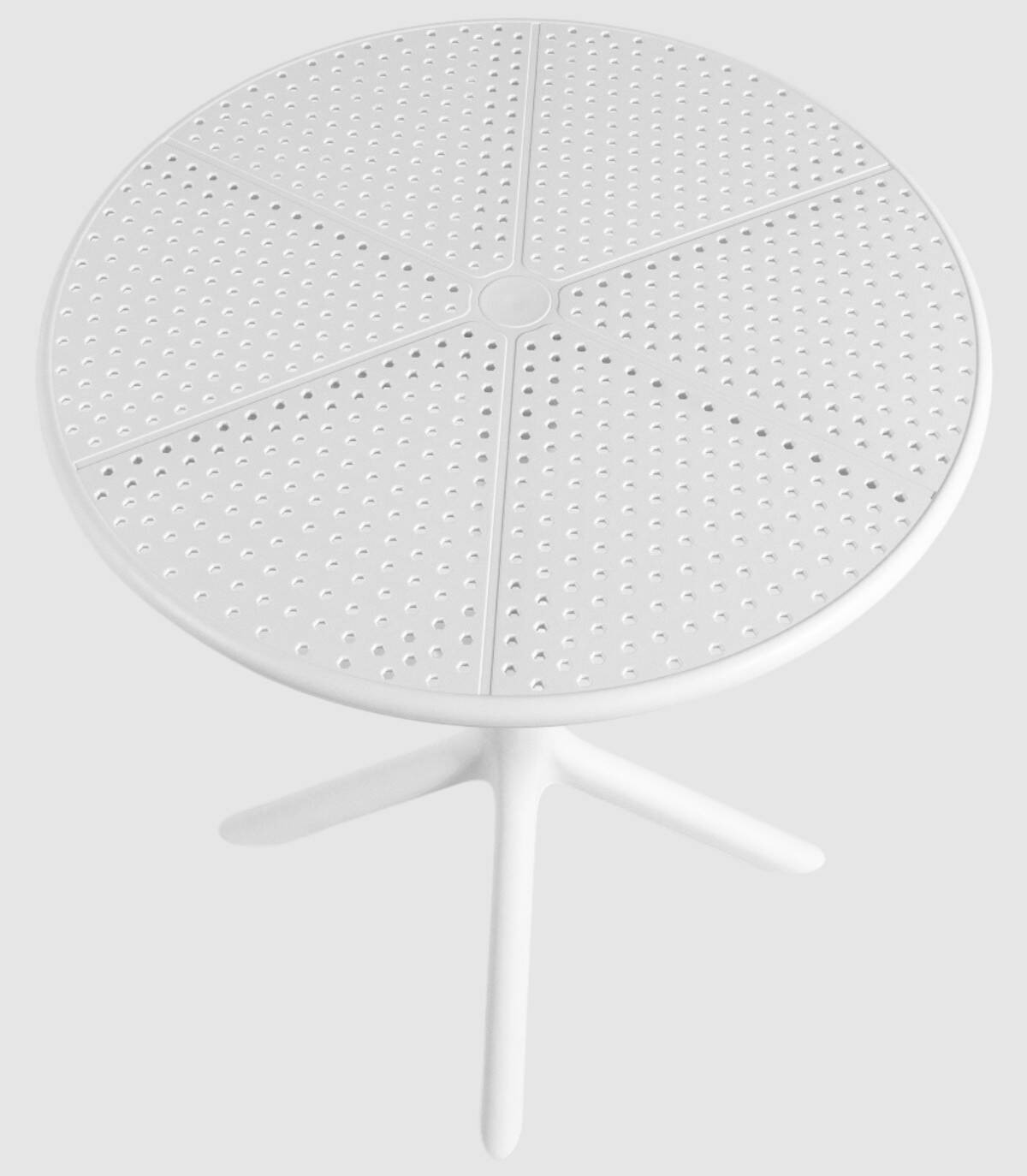 La mesa Cocoa redonda de exterior se compone de tablero fabricado en polipropileno con perforaciones sobre estructura de polipropileno con cuatro patas con una columna central.