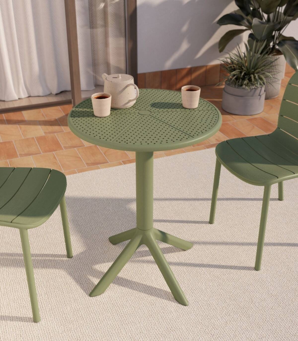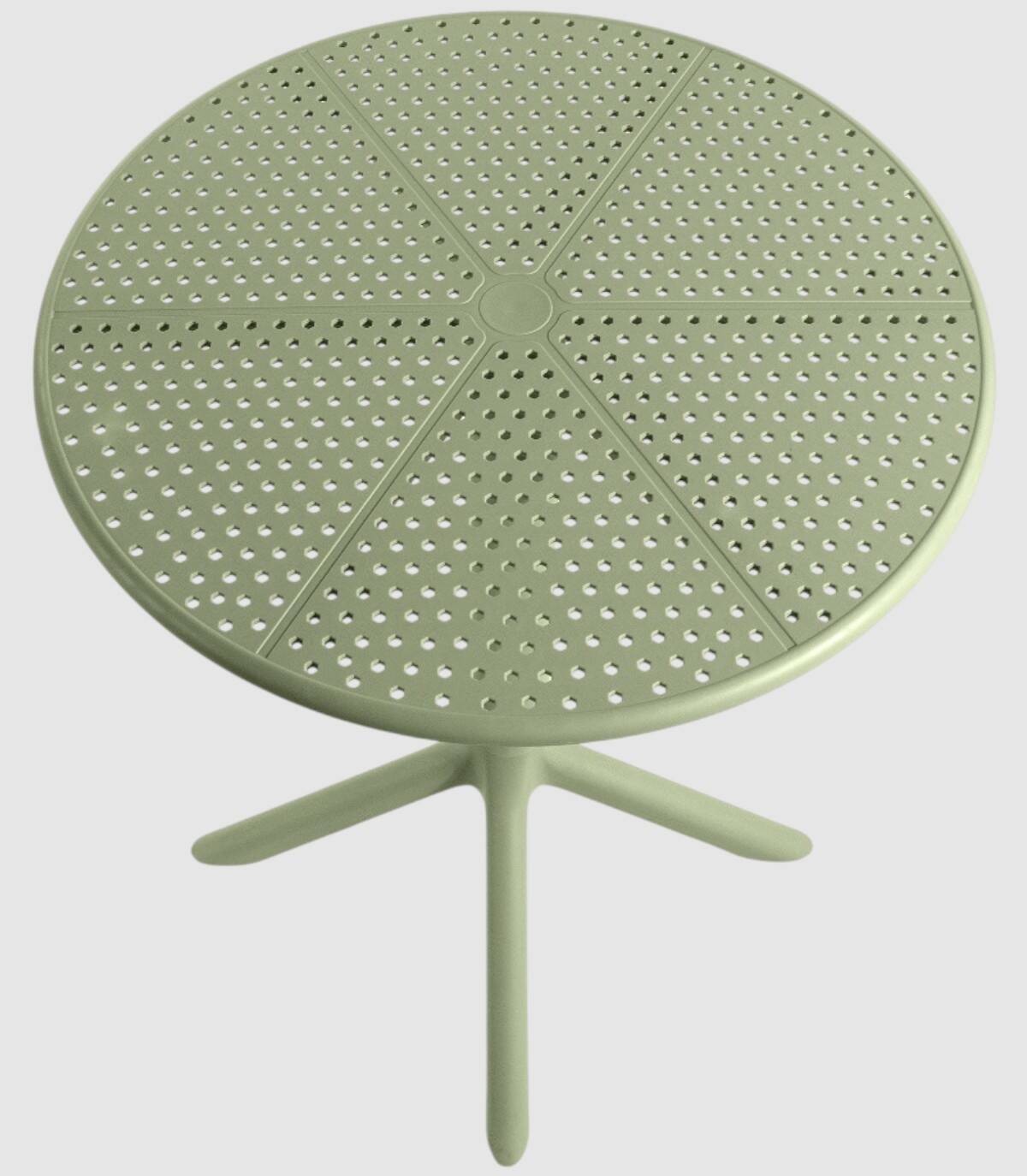 La mesa Cocoa redonda de exterior se compone de tablero fabricado en polipropileno con perforaciones sobre estructura de polipropileno con cuatro patas con una columna central.