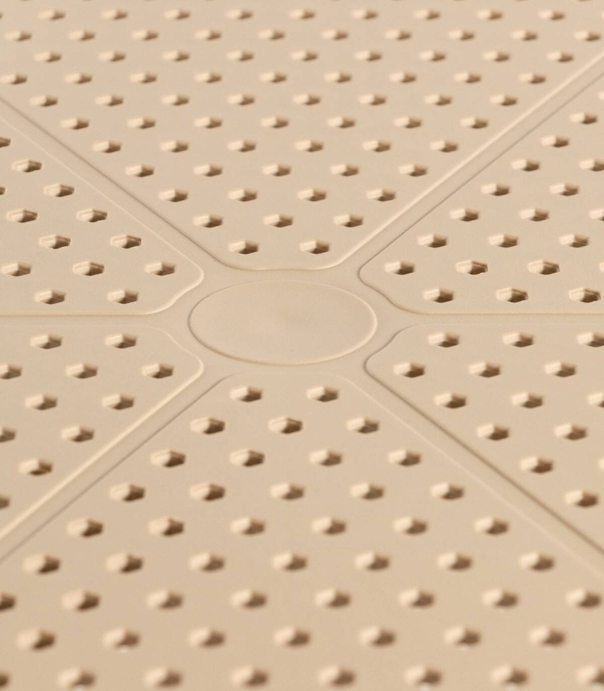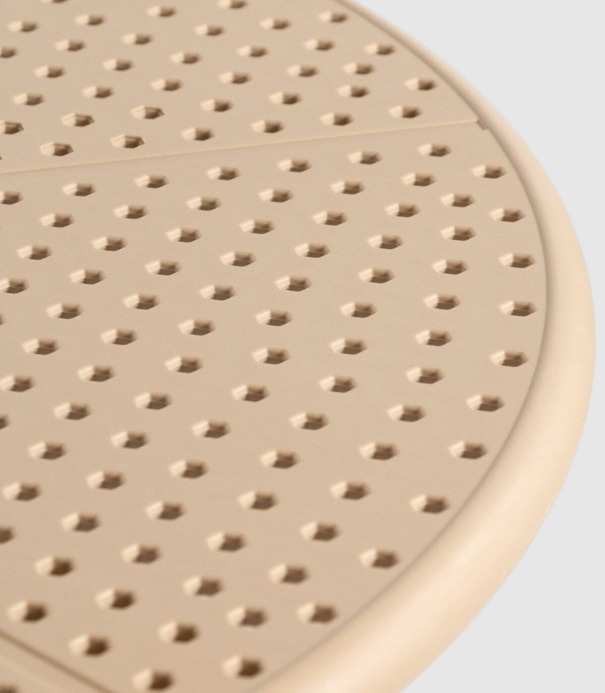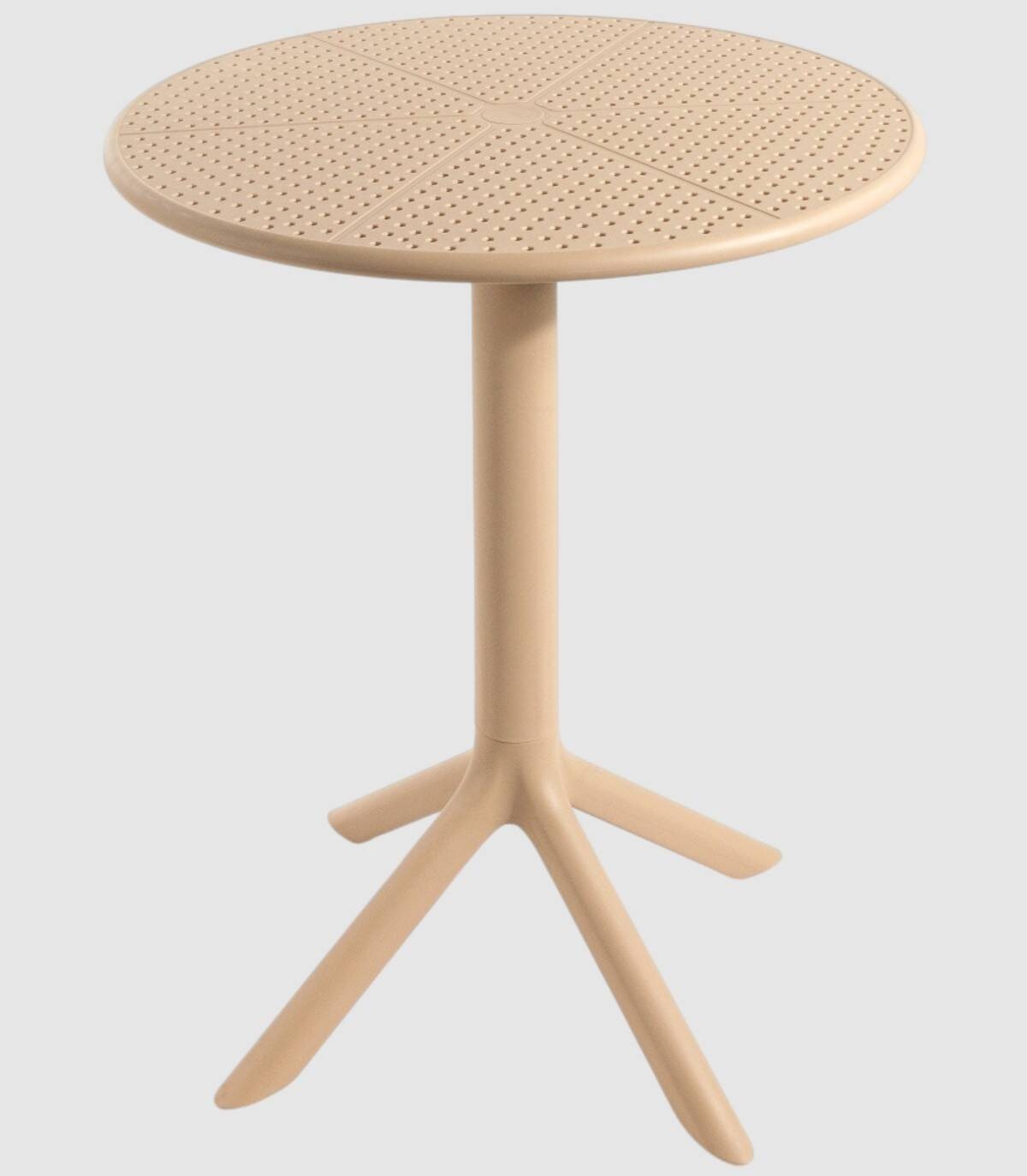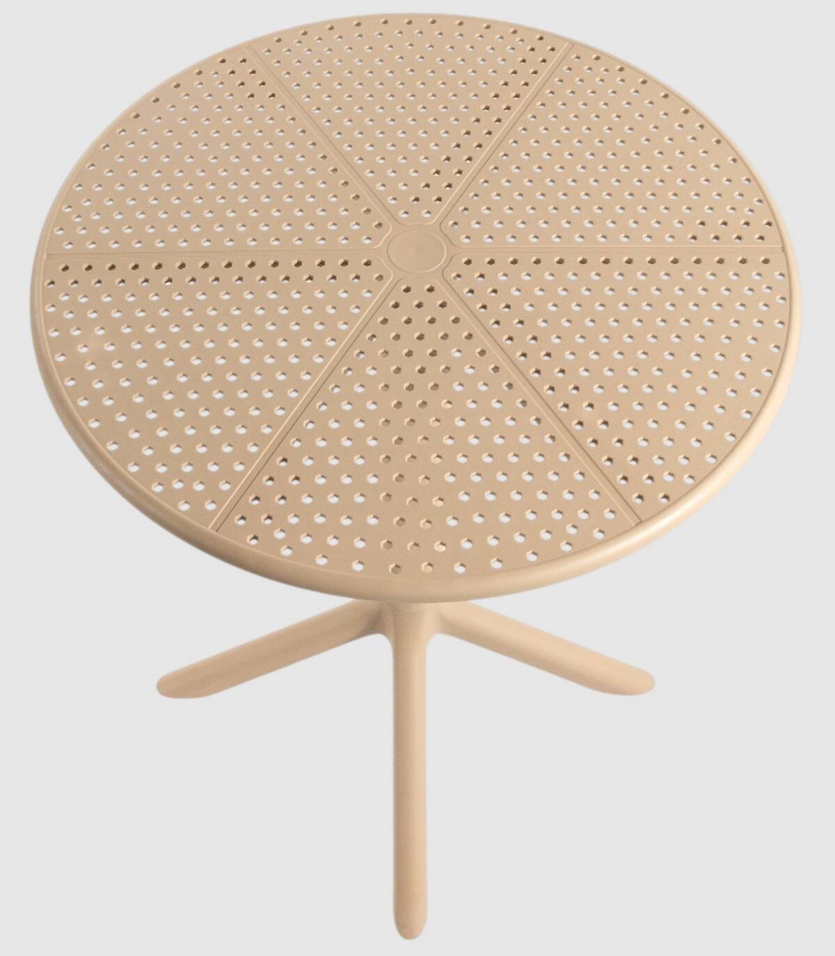 La mesa Cocoa redonda de exterior se compone de tablero fabricado en polipropileno con perforaciones sobre estructura de polipropileno con cuatro patas con una columna central.