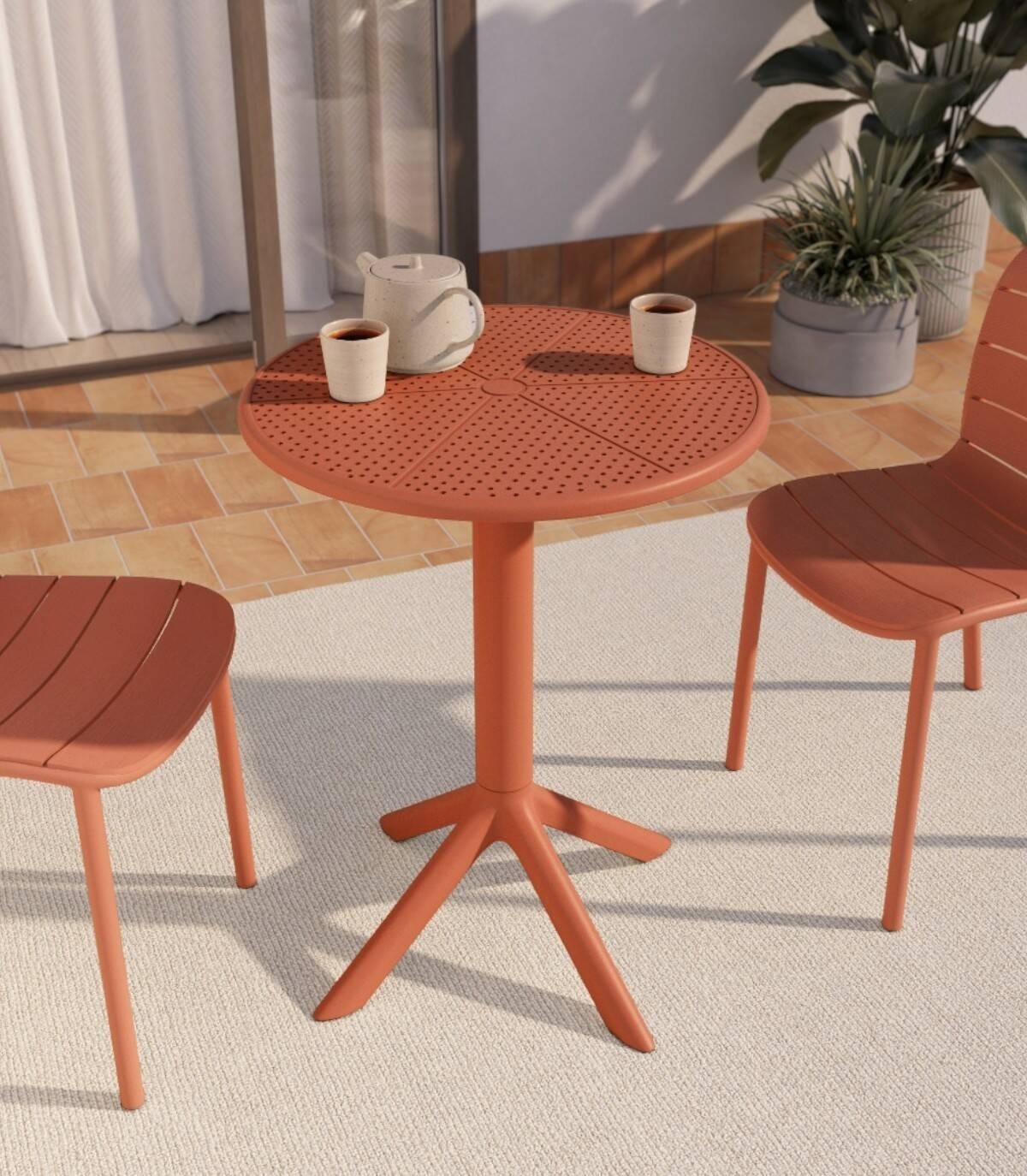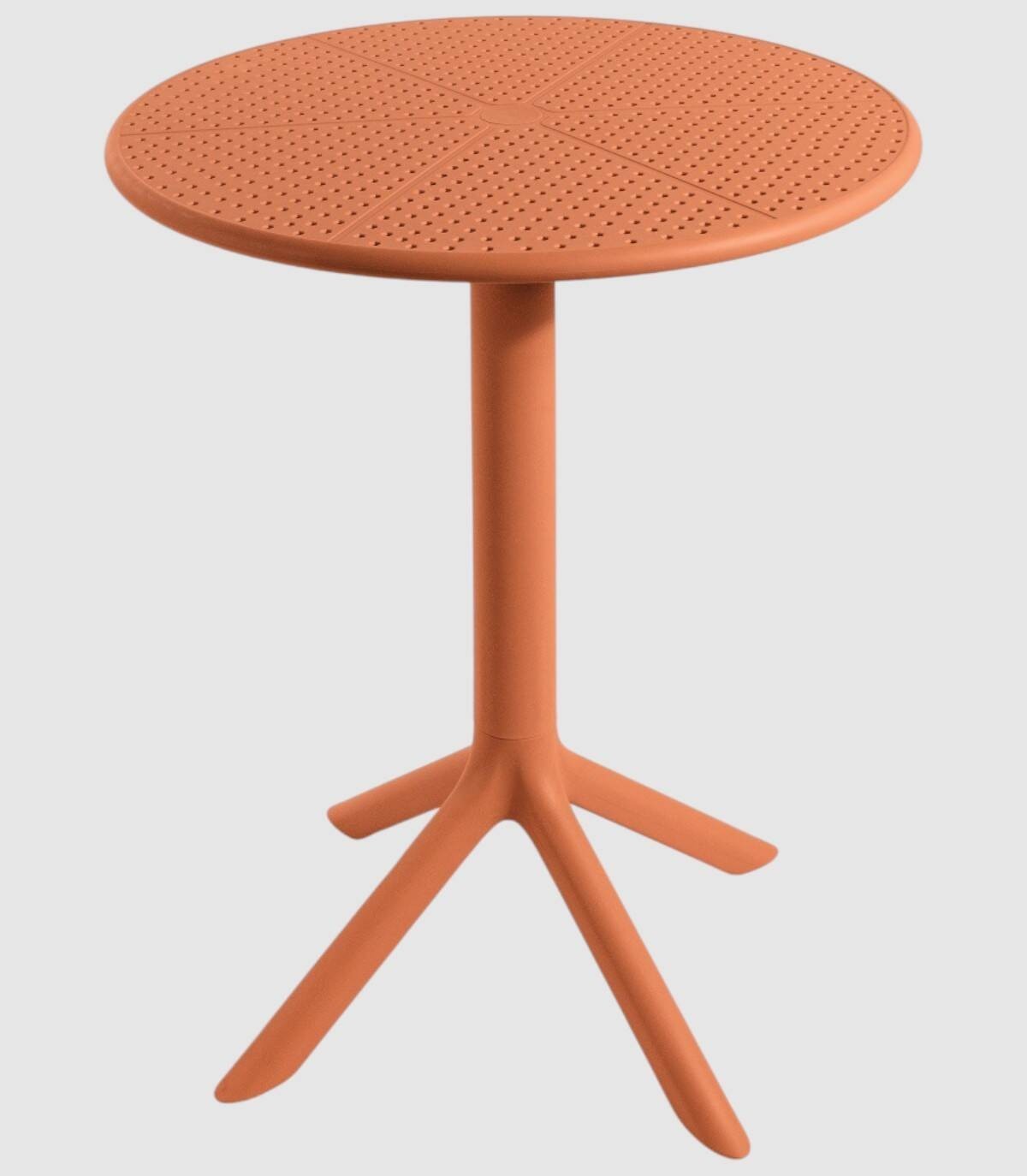 La mesa Cocoa redonda de exterior se compone de tablero fabricado en polipropileno con perforaciones sobre estructura de polipropileno con cuatro patas con una columna central.