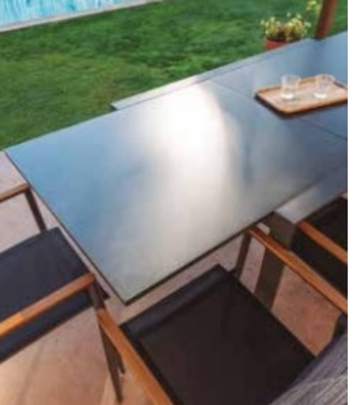 La mesa extensible de aluminio Slide está fabricada en aluminio con revestimiento en polvo (poliéster). Tiene una superficie rectangular lisa de aluminio. Las 4 patas tienen tapones antideslizantes.