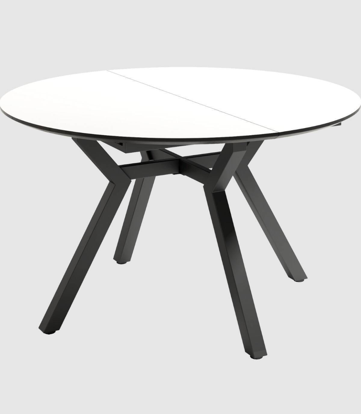 La mesa Cantábrico redonda con extensión, de diseño elegante y moderno, tiene sobre biselado con acabado estilo madera y estructura de metal con barnizado negro.