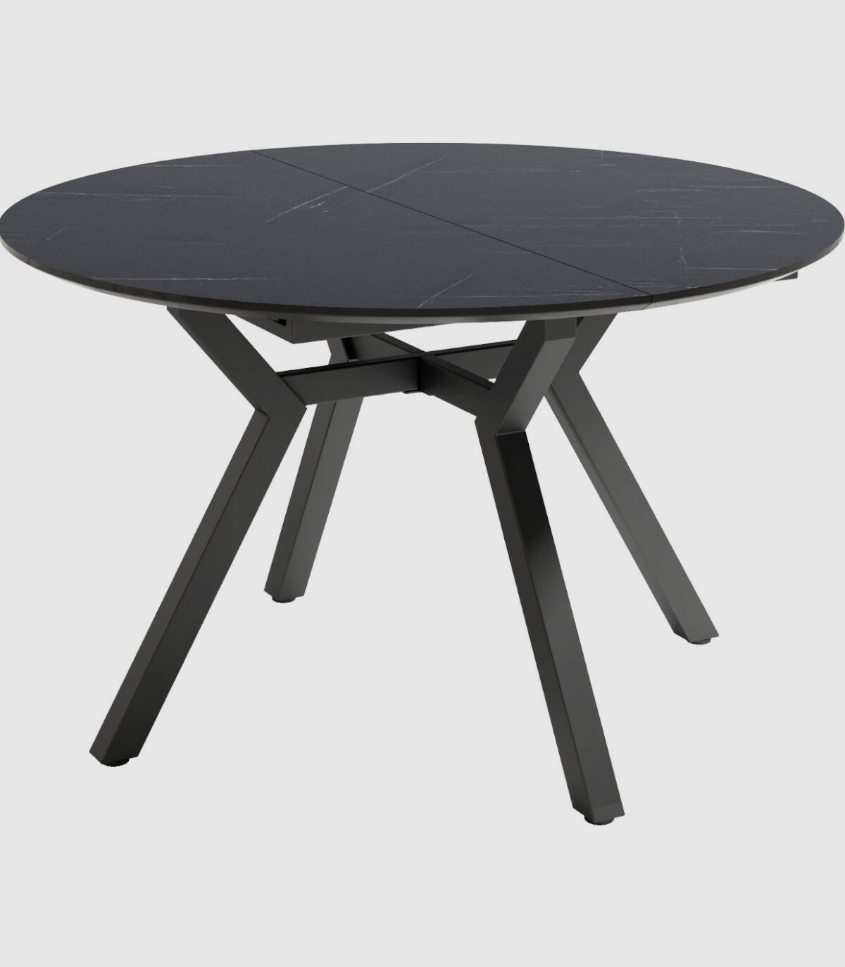 La mesa Cantábrico redonda con extensión, de diseño elegante y moderno, tiene sobre biselado con acabado estilo piedra y estructura de metal con barnizado negro.