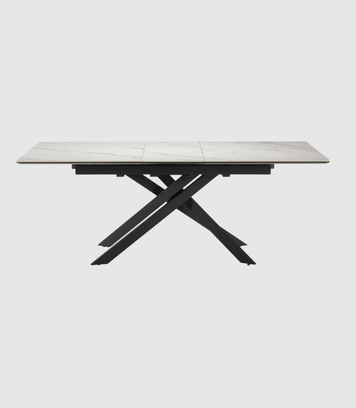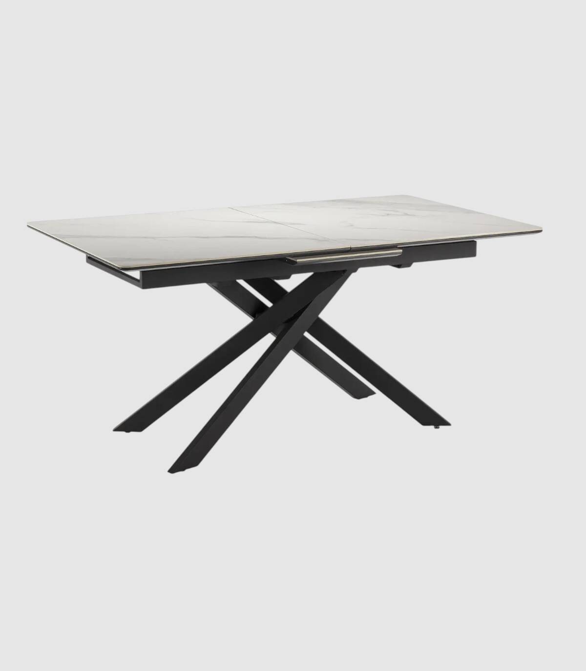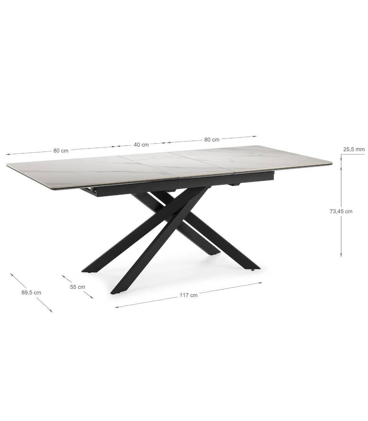 La mesa extensible de comedor Tenzy se compone de tablero rectangular de cerámica, en tres partes con una extensión central que se esconde debajo, sobre cuatro patas de metal pintado de color negro.