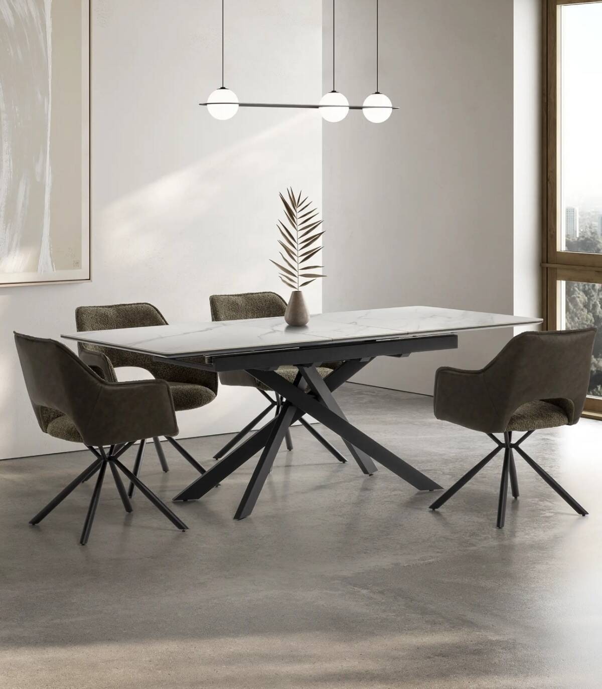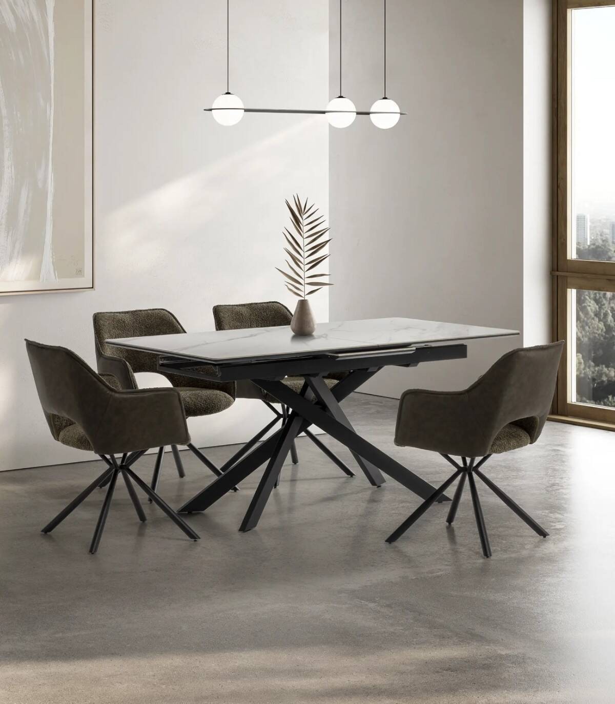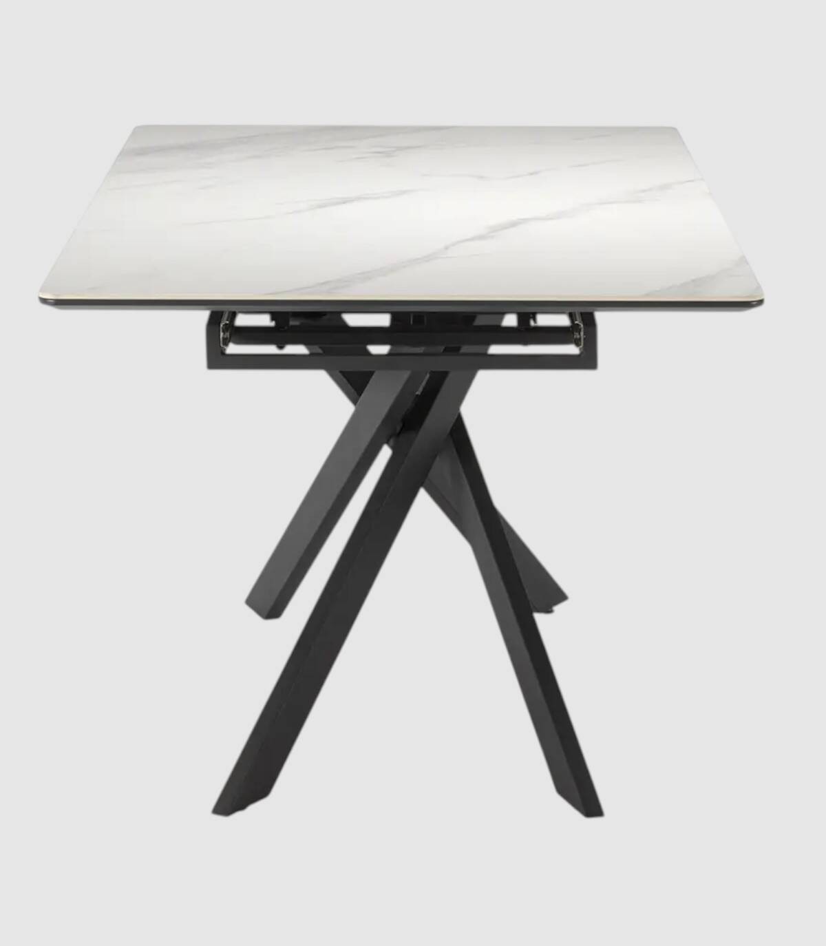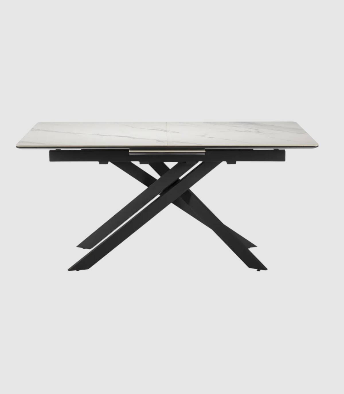 La mesa extensible de comedor Tenzy se compone de tablero rectangular de cerámica, en tres partes con una extensión central que se esconde debajo, sobre cuatro patas de metal pintado de color negro.