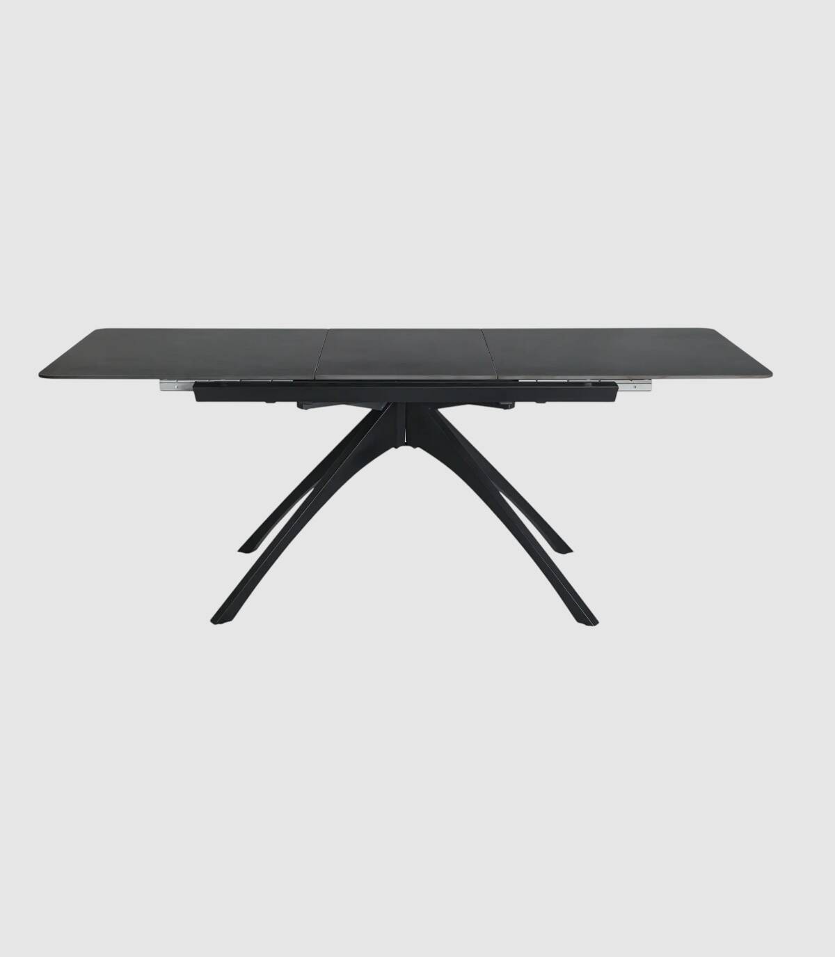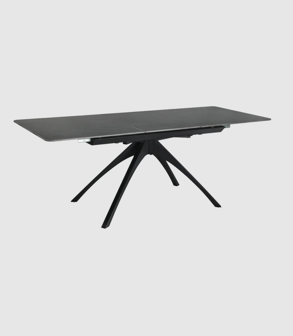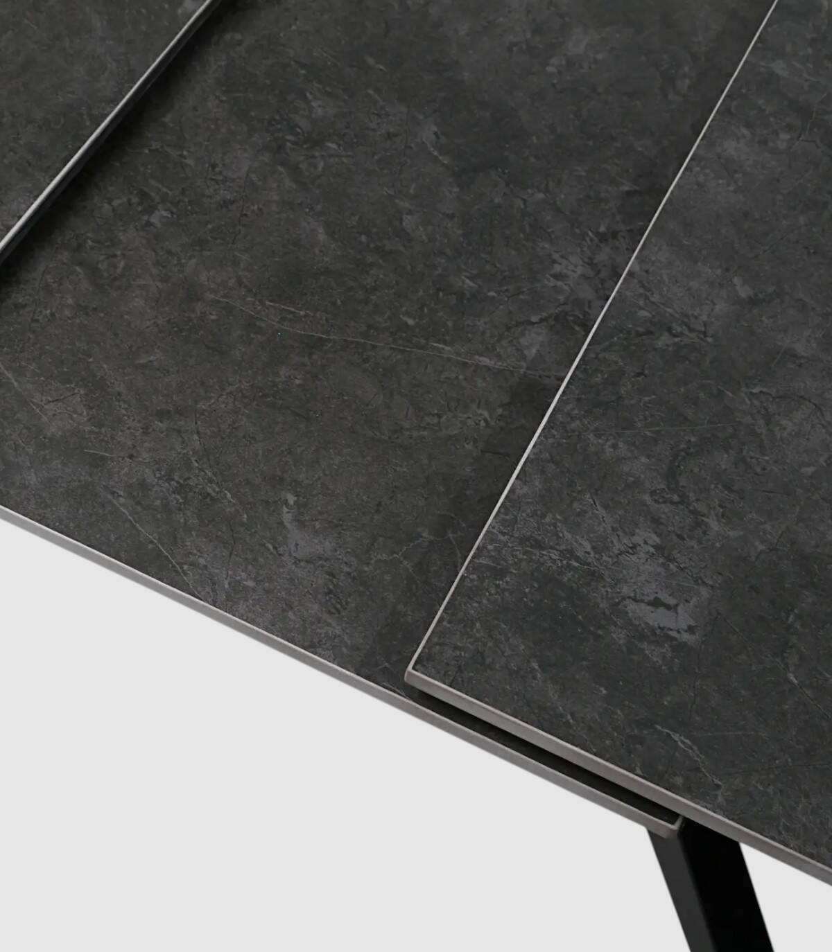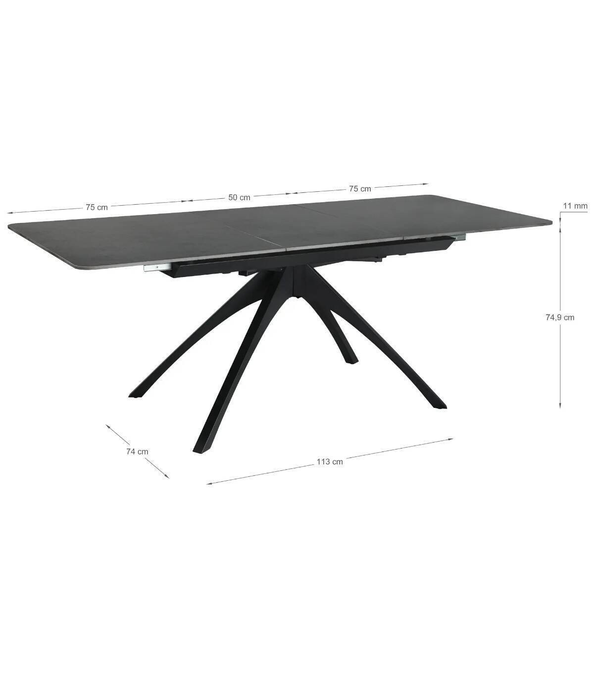 La mesa extensible de comedor Nacur se compone de tablero rectangular de piedra sinterizada, con tres partes, una extensible en el centro que se esconde debajo, sobre cuatro patas de metal pintado de color negro.