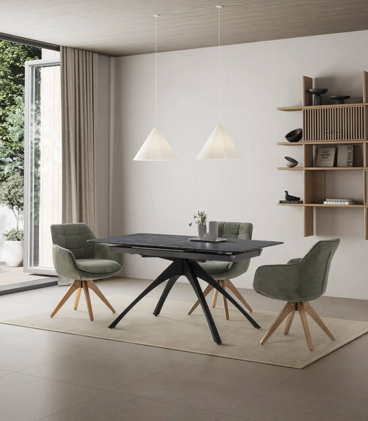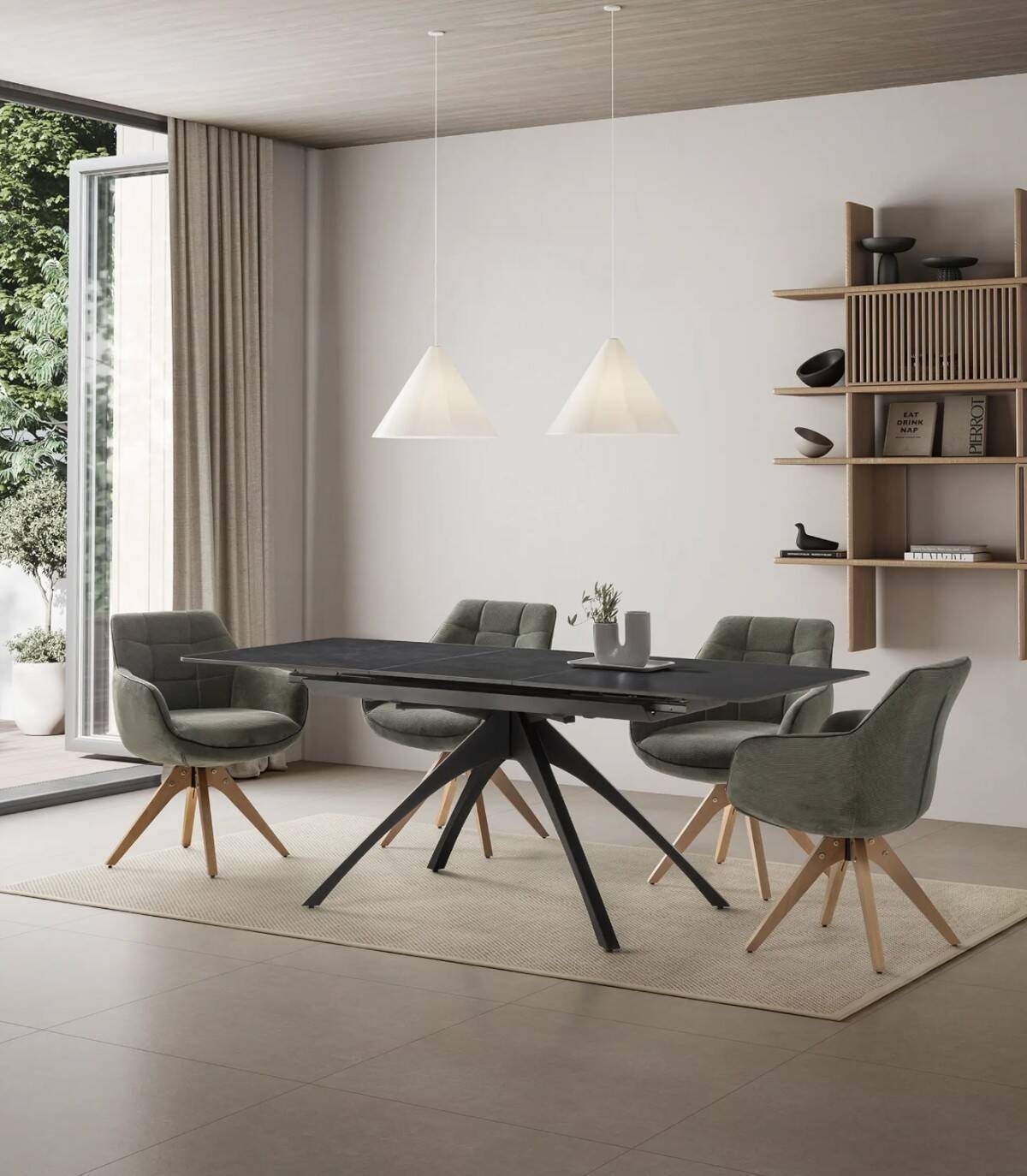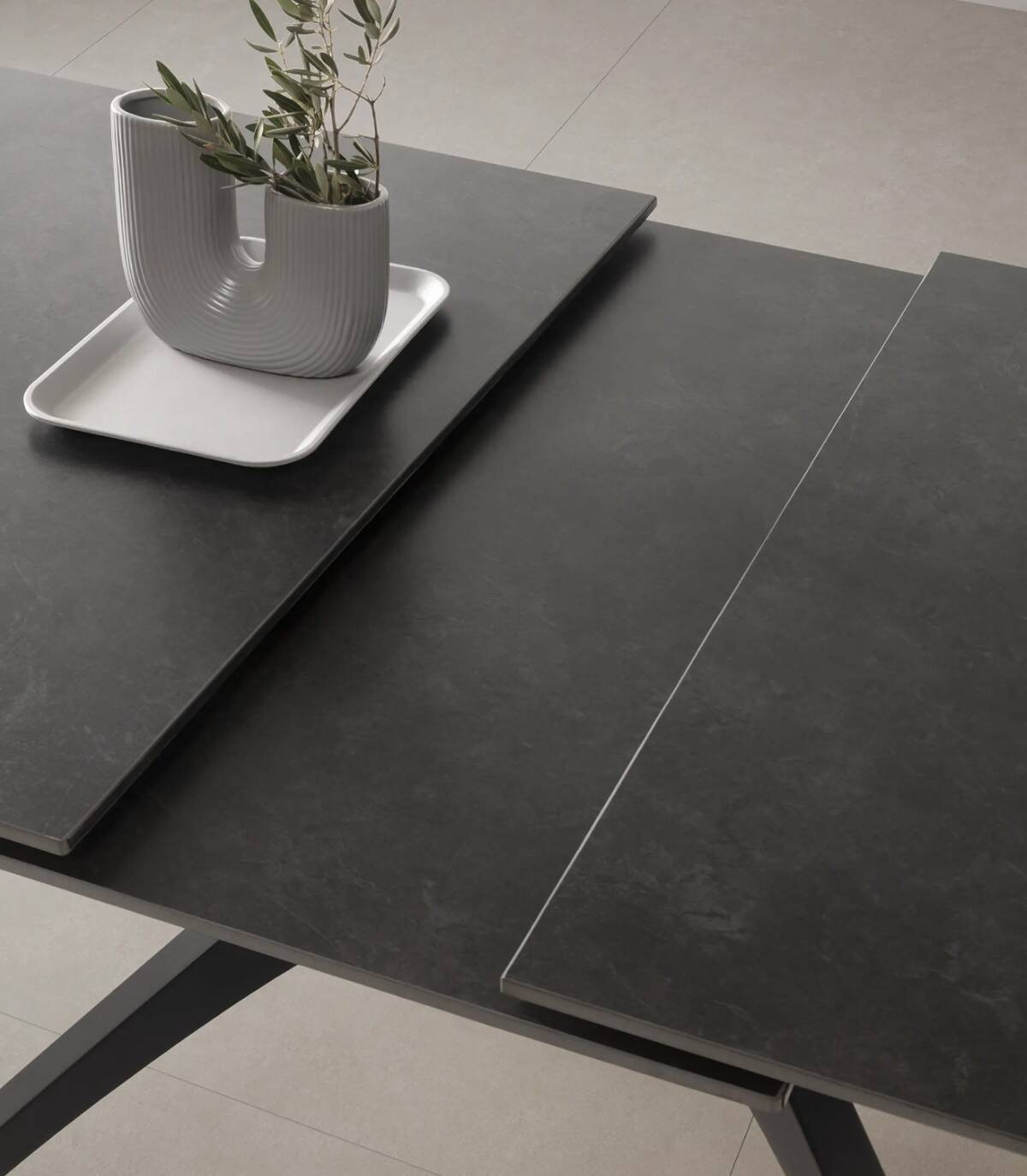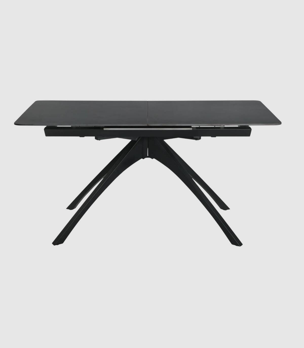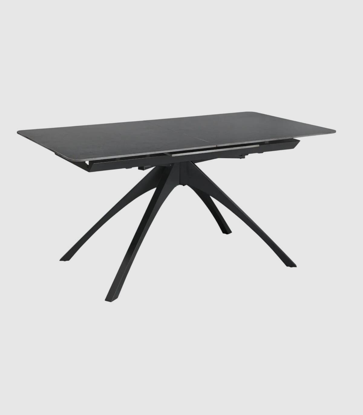 La mesa extensible de comedor Nacur se compone de tablero rectangular de piedra sinterizada, con tres partes, una extensible en el centro que se esconde debajo, sobre cuatro patas de metal pintado de color negro.