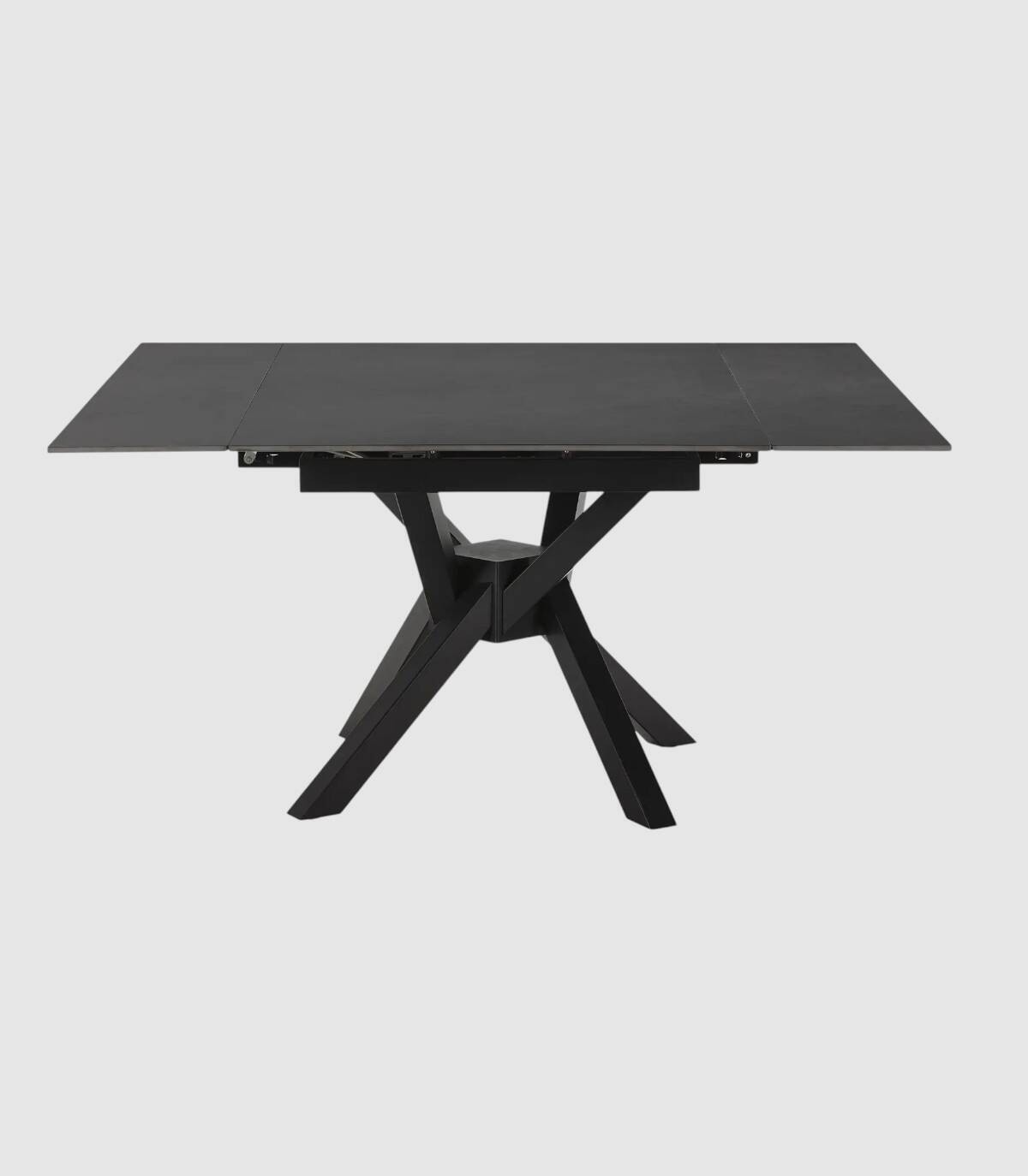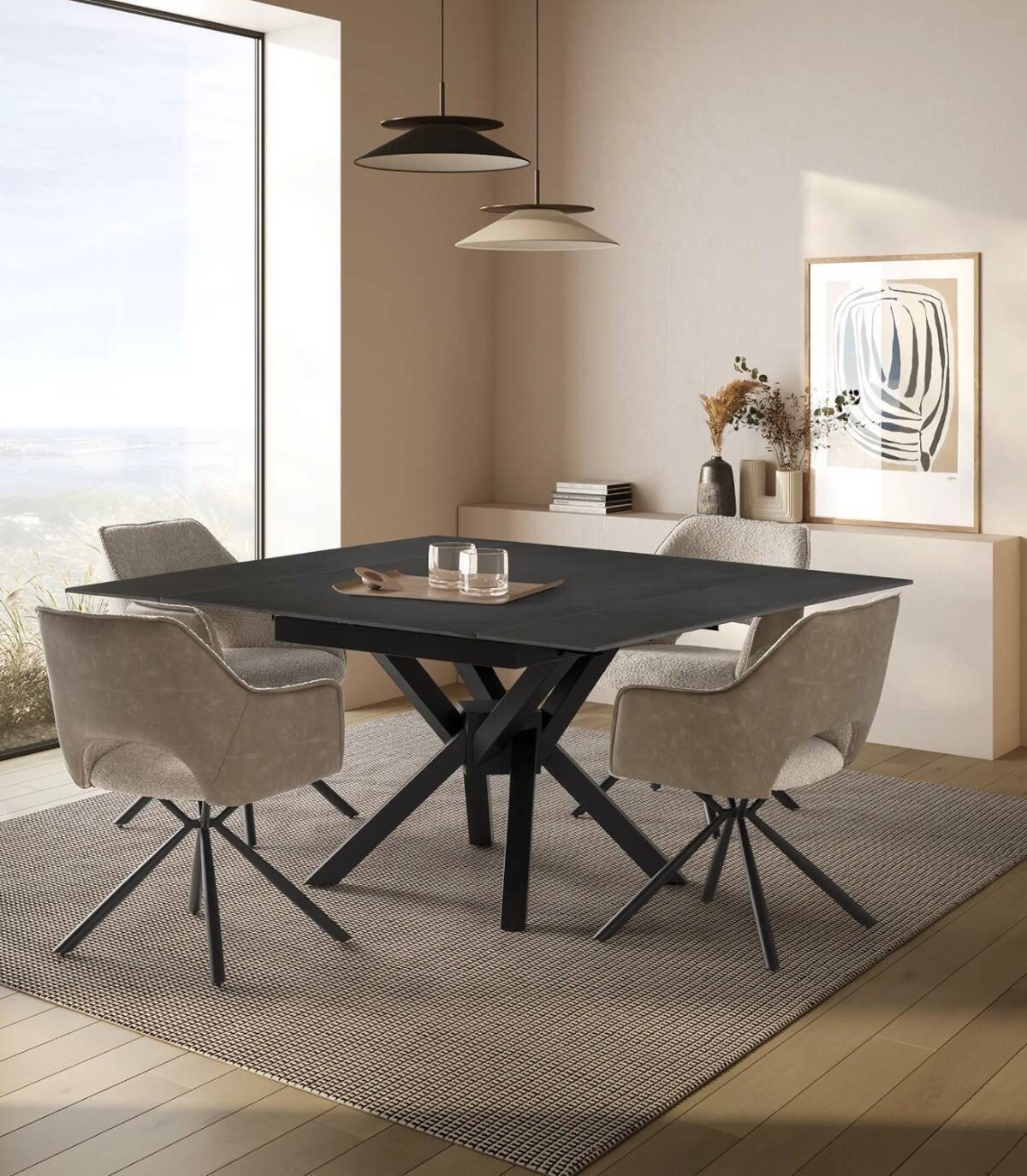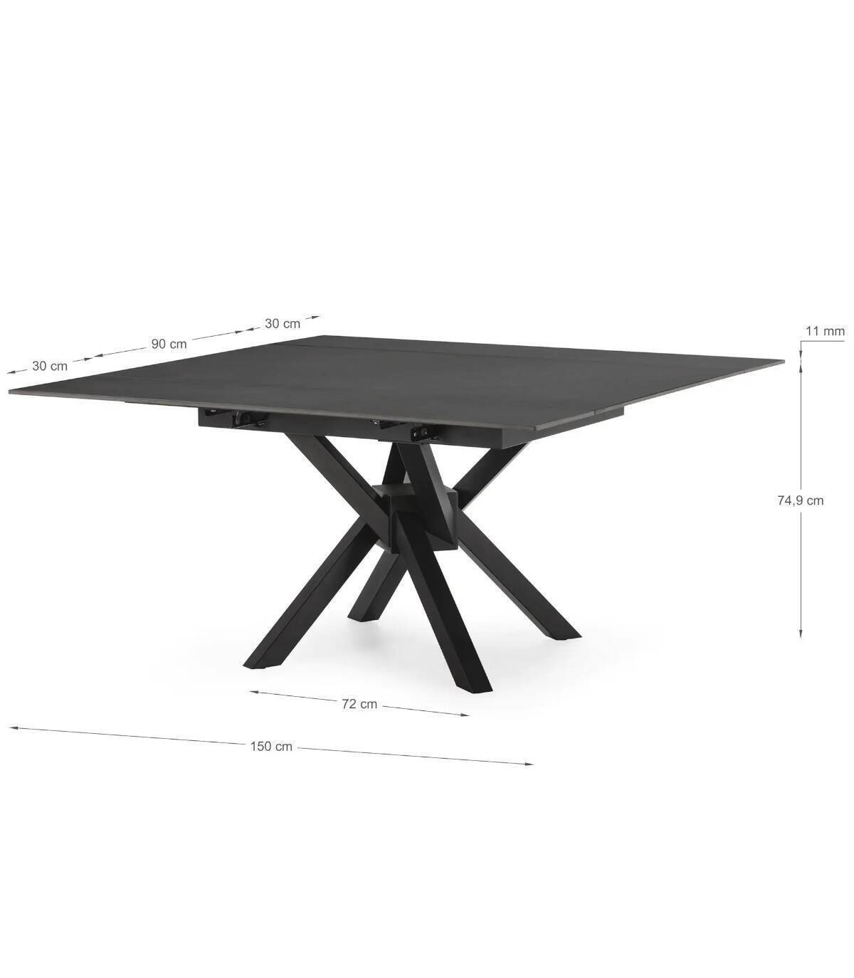 La mesa extensible de comedor Senir se compone de tablero rectangular, con dos extensiones laterales que lo hacen cuadrado, de piedra sinterizada sobre cuatro patas de metal pintado de color negro.