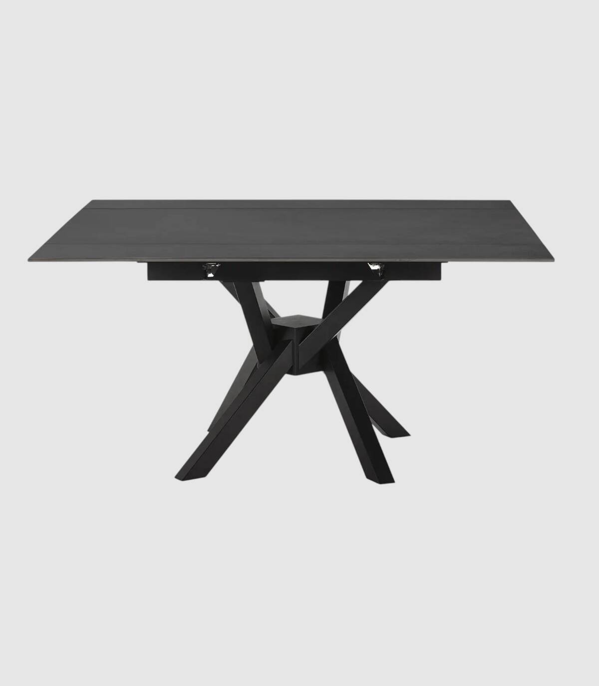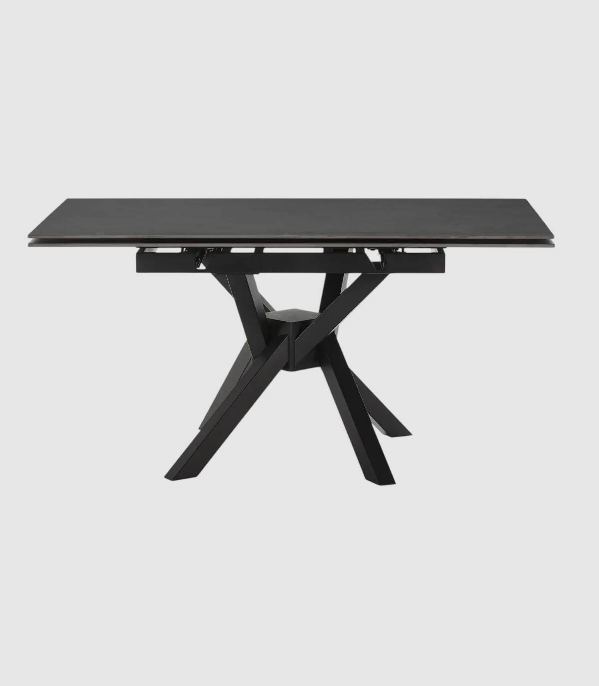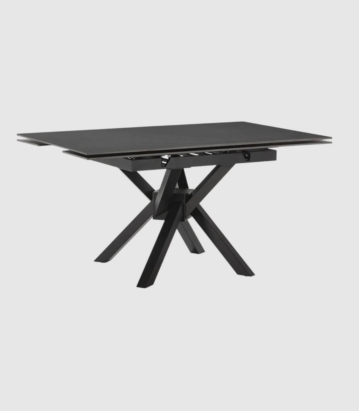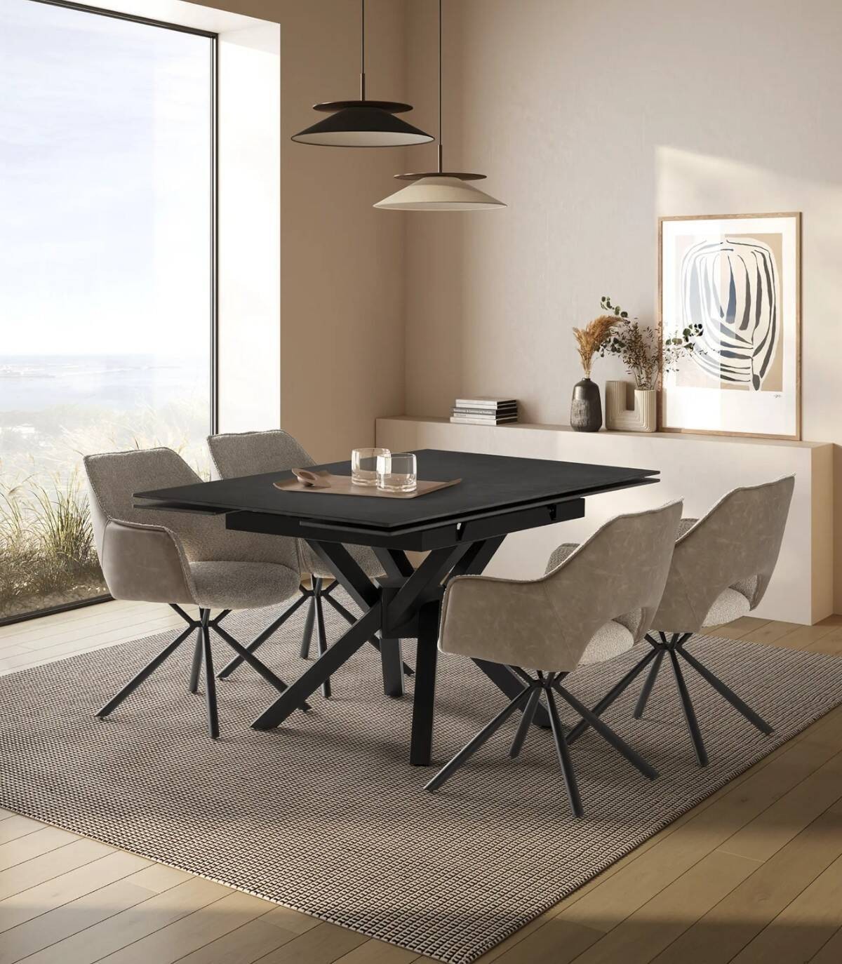 La mesa extensible de comedor Senir se compone de tablero rectangular, con dos extensiones laterales que lo hacen cuadrado, de piedra sinterizada sobre cuatro patas de metal pintado de color negro.