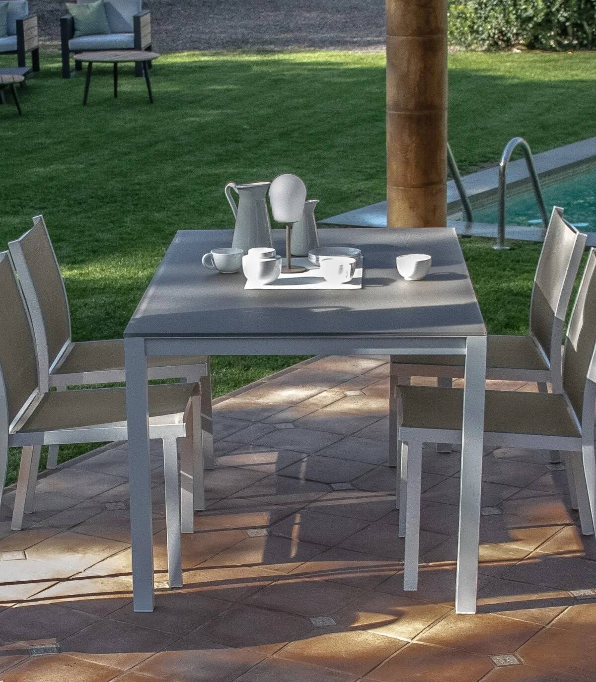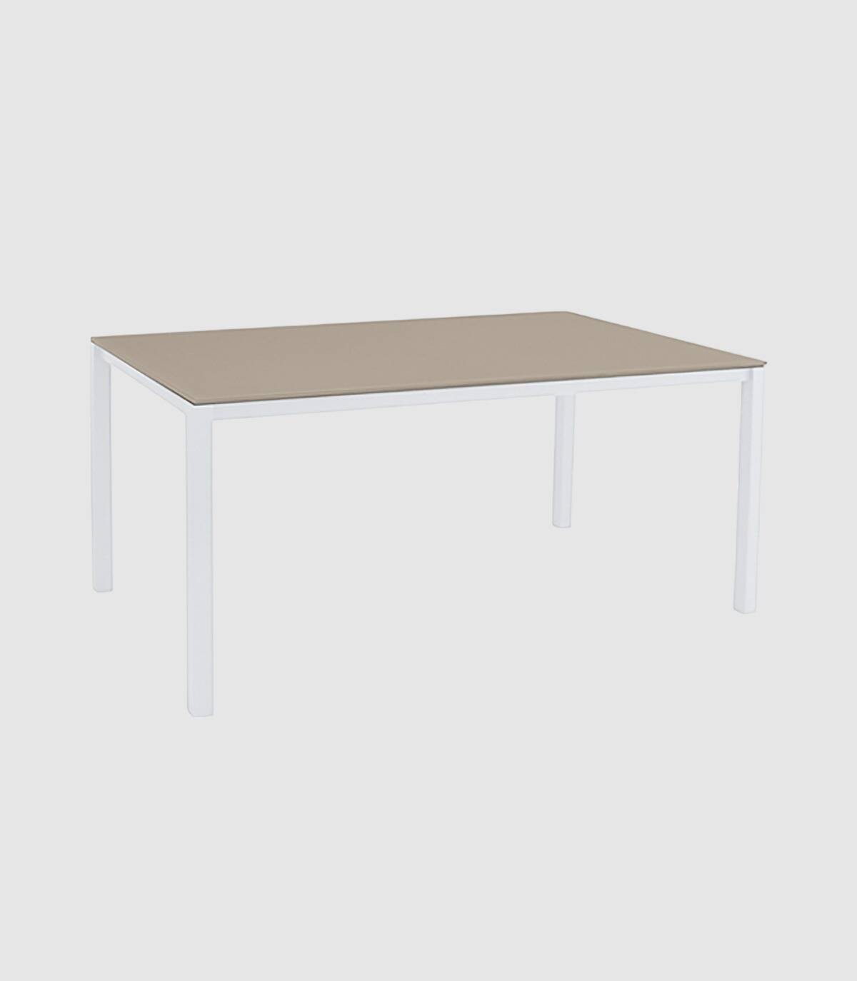 La mesa de comedor Una está fabricada en aluminio con revestimiento en polvo (poliéster). Tiene una superficie rectangular lisa de cristal. Las 4 patas tienen tapones antideslizantes.