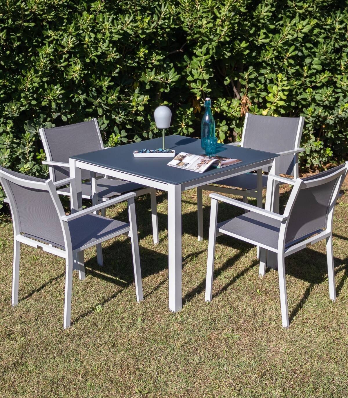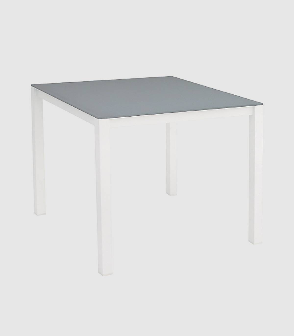 La mesa de comedor Una está fabricada en aluminio con revestimiento en polvo (poliéster). Tiene una superficie rectangular lisa de cristal. Las 4 patas tienen tapones antideslizantes.