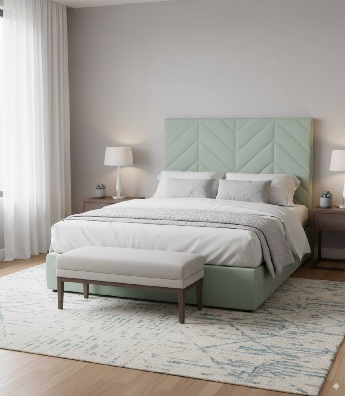 Cabezal Indico tapizado de color azul para camas de 180 centimetros de ancho.