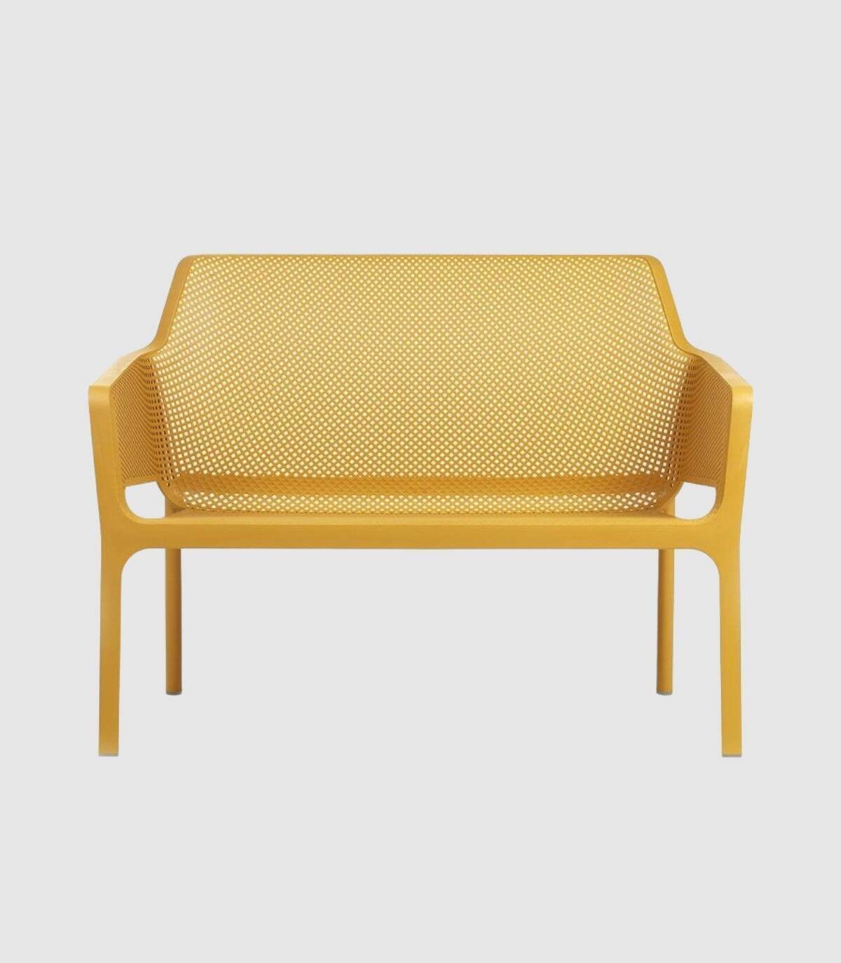 El banco de 2 asientos Net tiene un estilo red monobloc. Material: polipropileno fiberglass tratado anti-UV y teñido en masa. Resina reciclable. Efecto mate. Con tapones antideslizantes.