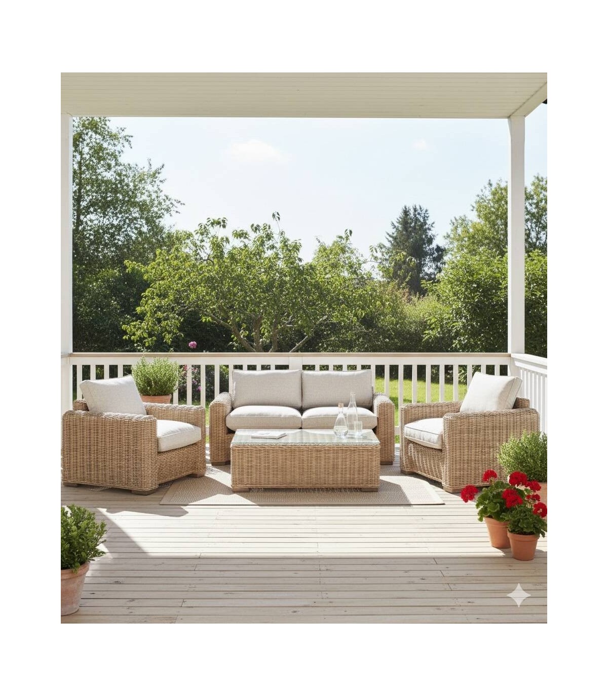 El set Nimba está fabricada con una trama de ratán natural con el respaldo de forma redondeada. Se compone de un sofá de dos plazas, dos sillones y una mesa de centro con cristal. Incluye cojínes gris.