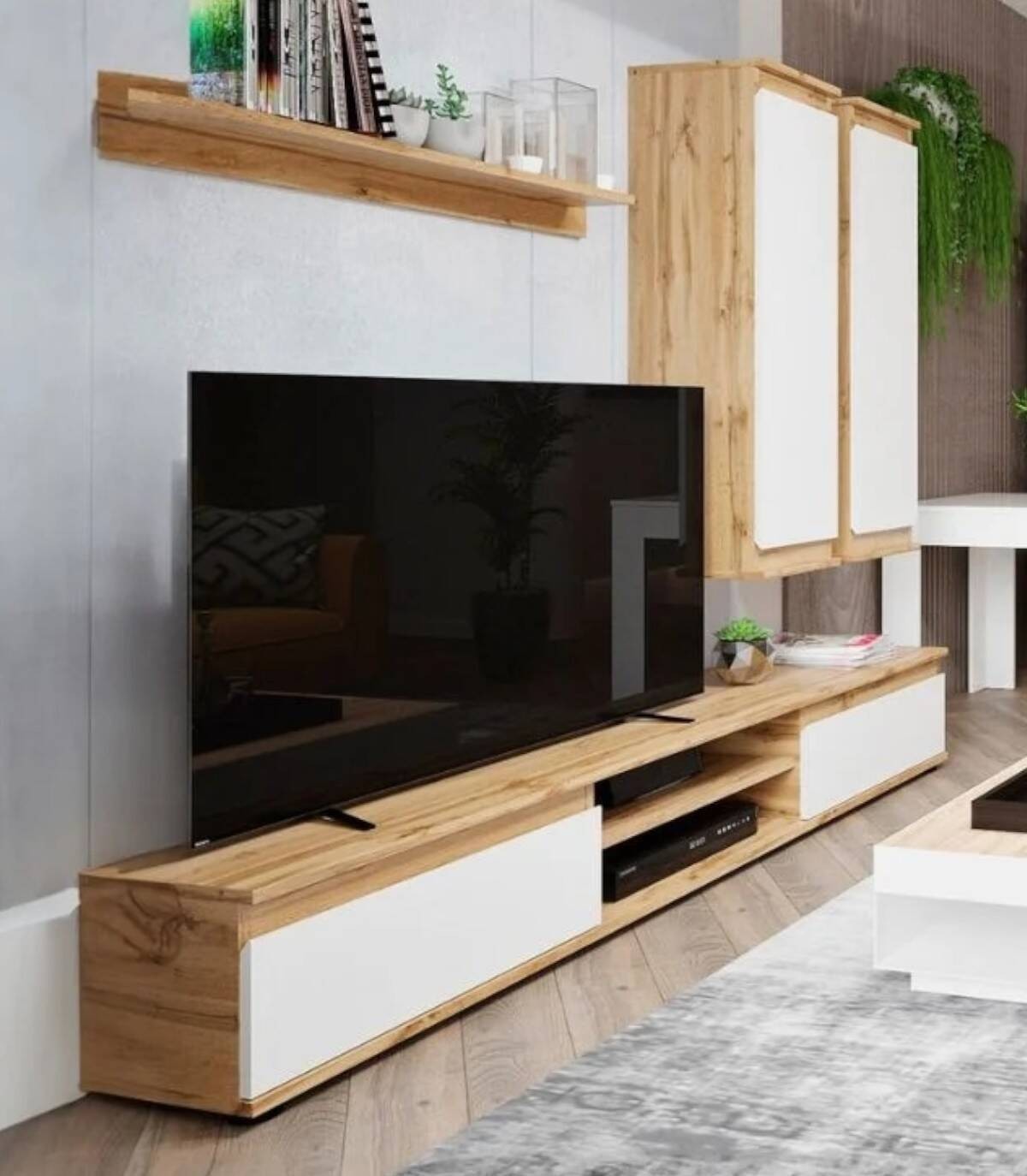 Muebles Lusia de salón moderno, compuesto por una mesa de televisión con dos puertas y una balda en medio, un estante y dos armarios que están soportados en la pared. La apertura de los armarios es distinta, uno abre hacia la izquierda y otro hacia la derecha.