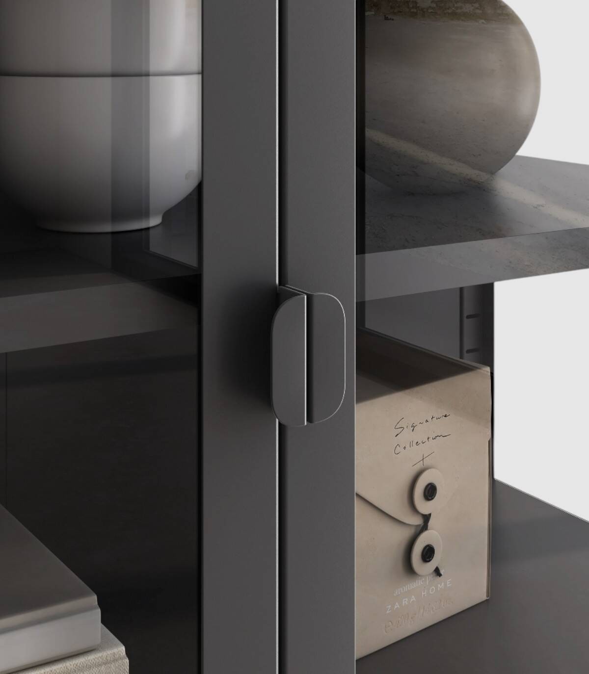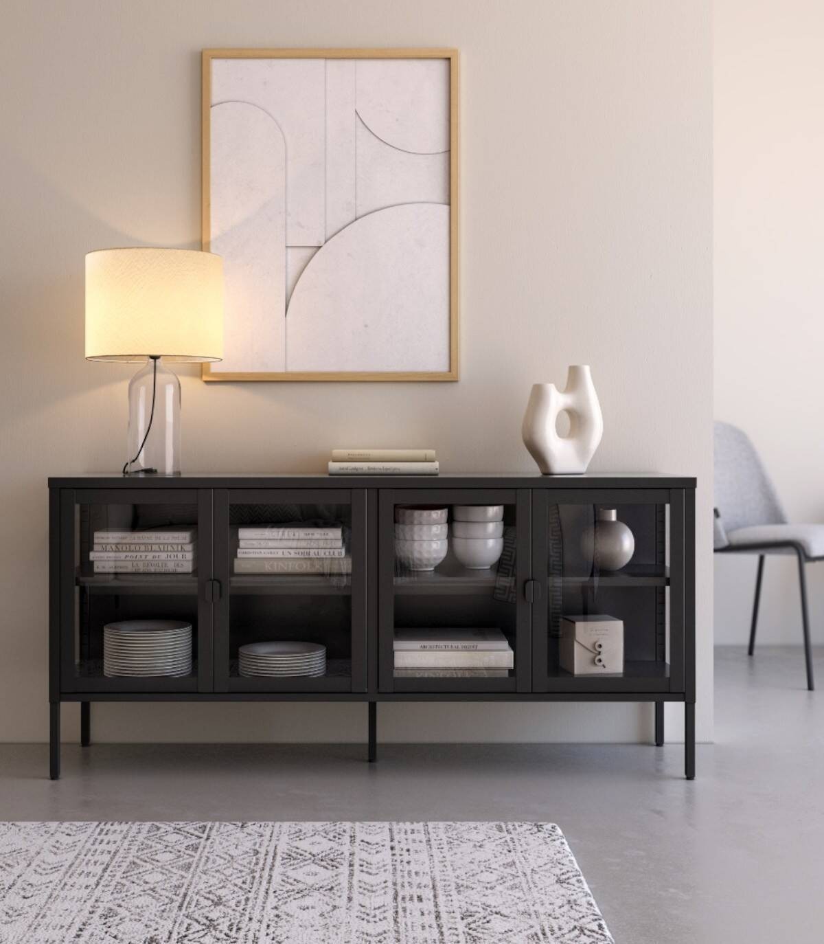 El aparador Titania se compone de estructura de color negro con cinco patas, dos baldas y cuatro puertas de cristal con tiradores.