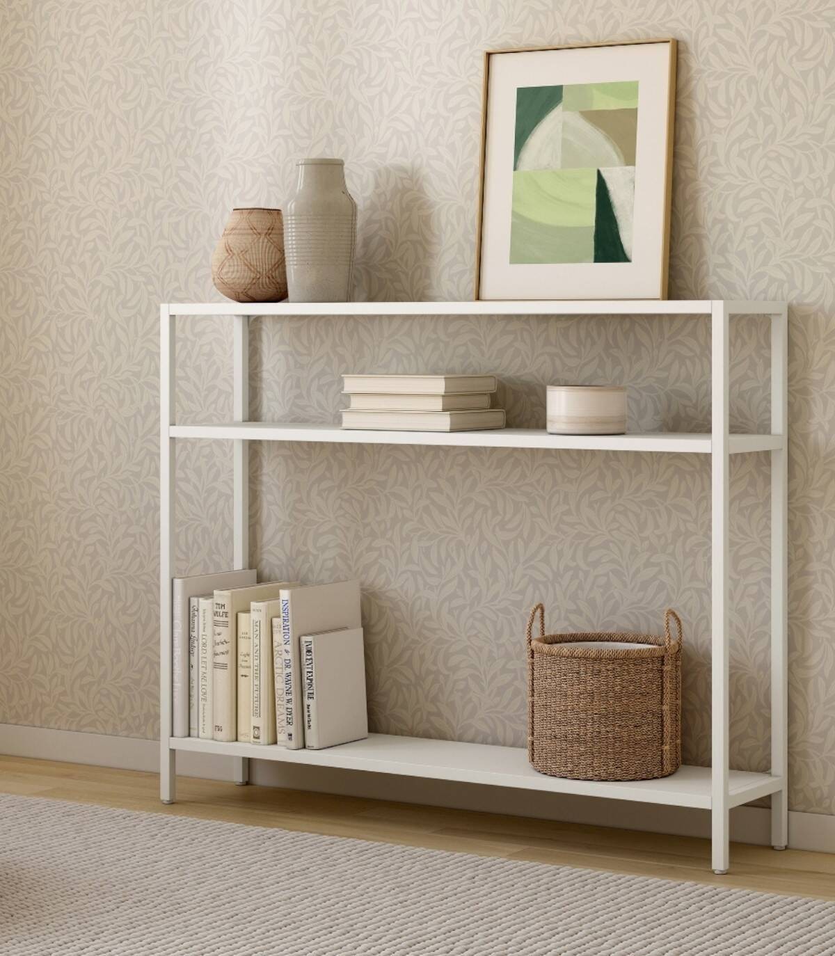 La estanteria de recibidor Titania grande se compone de estructura de color crema con cuatro patas y tres baldas en diferentes alturas.