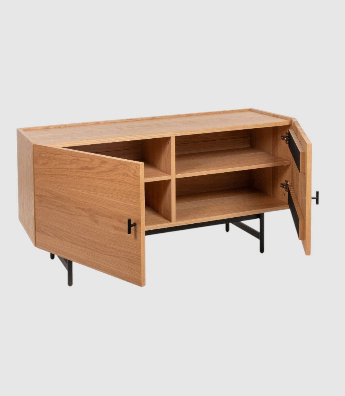 El mueble de TV Samurai se compone de dos puertas (una con diseño de espacios entre listones verticales) con estructura de madera de chapa natural de roble, tiradores y patas metálicas pintadas de color negro.