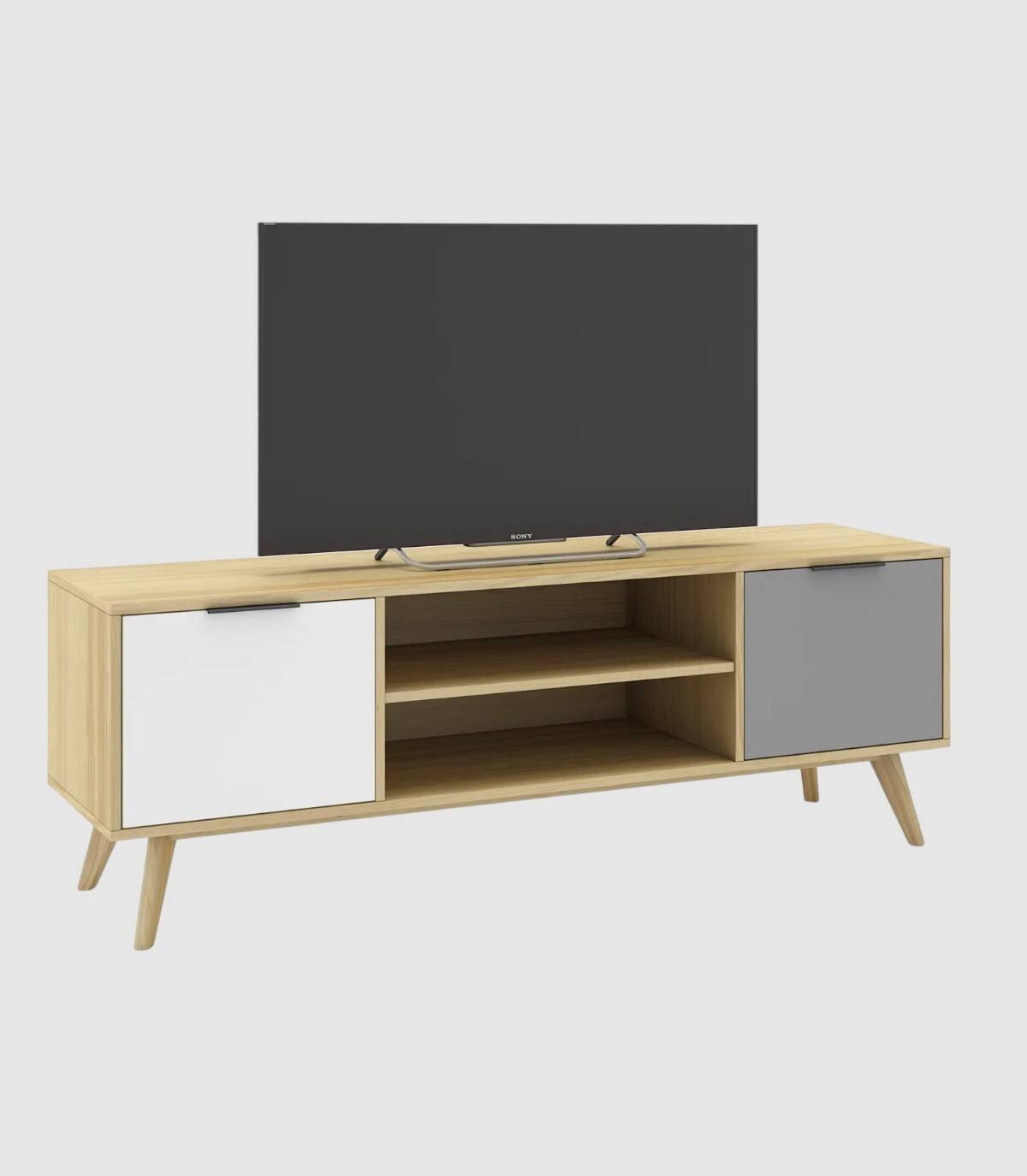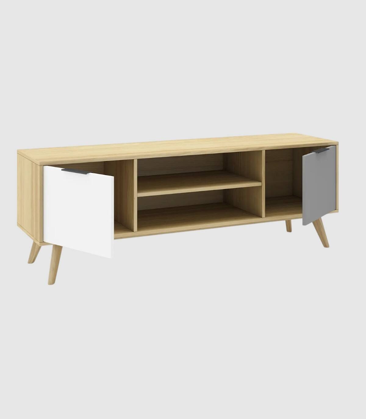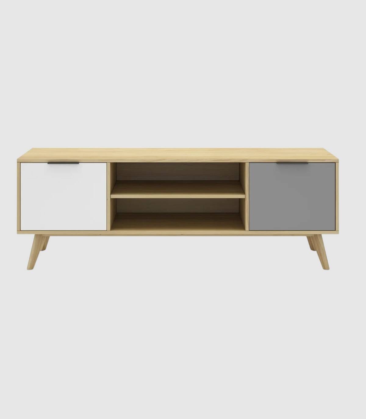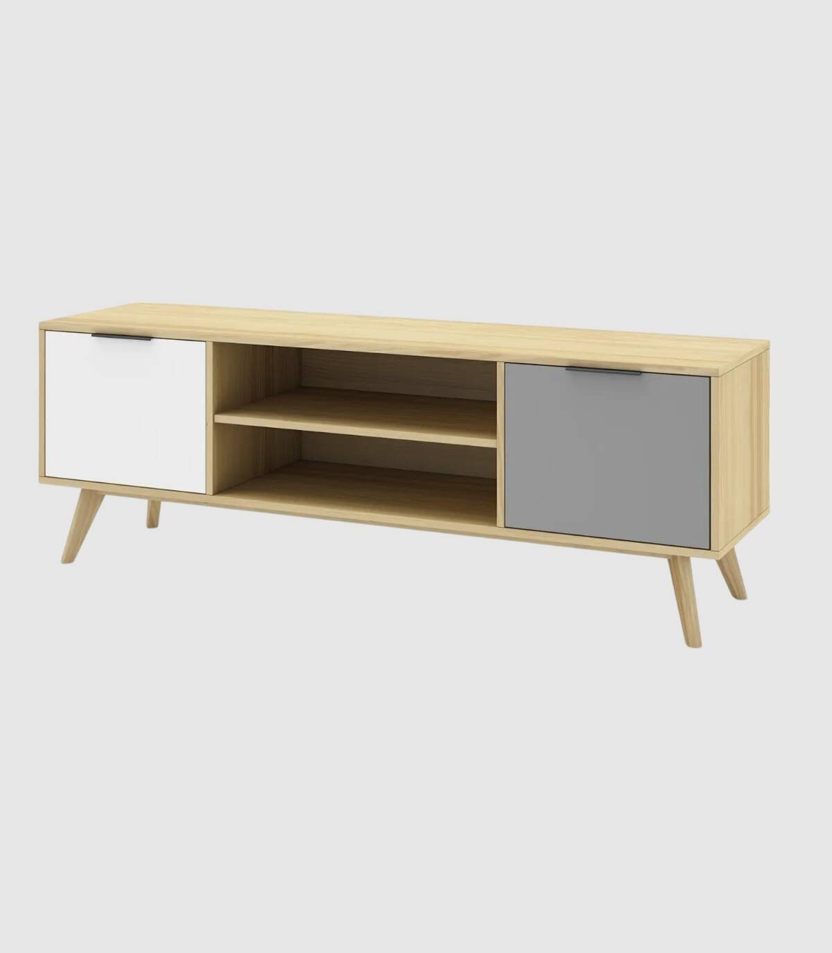 El mueble para televisores Lanuke se compone de dos puertas, una a la derecha con frontal gris, otra a la izquierda con frontal blanco, con tirador en el extremo superior y dos huecos separados por una balda en el centro, estructura y cuatro patas de pino de color madera.