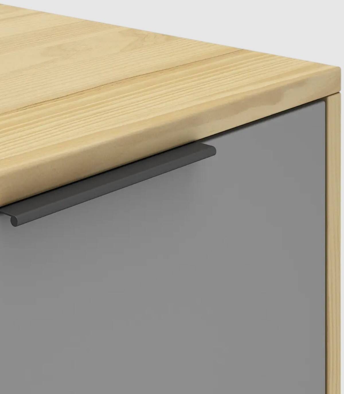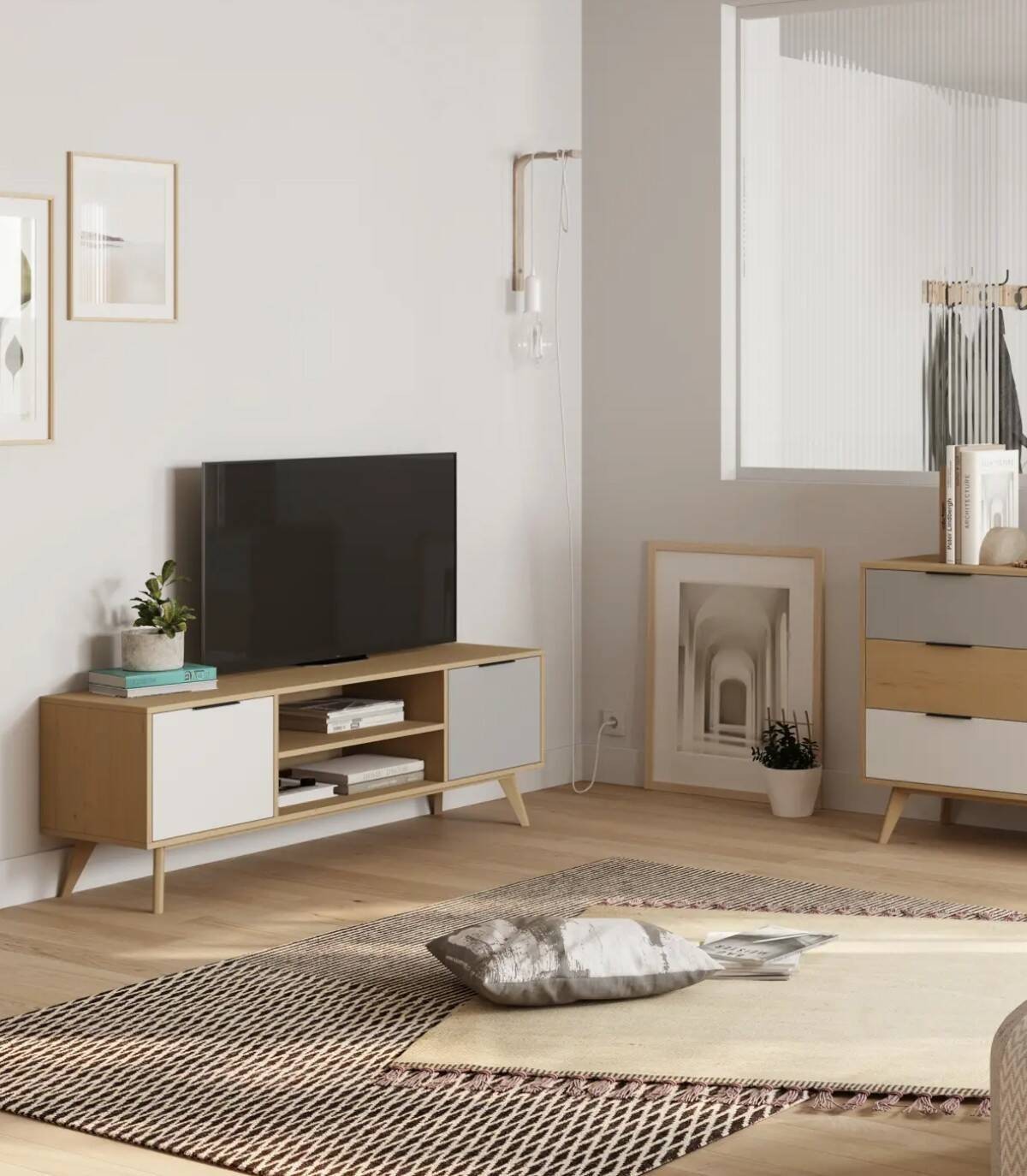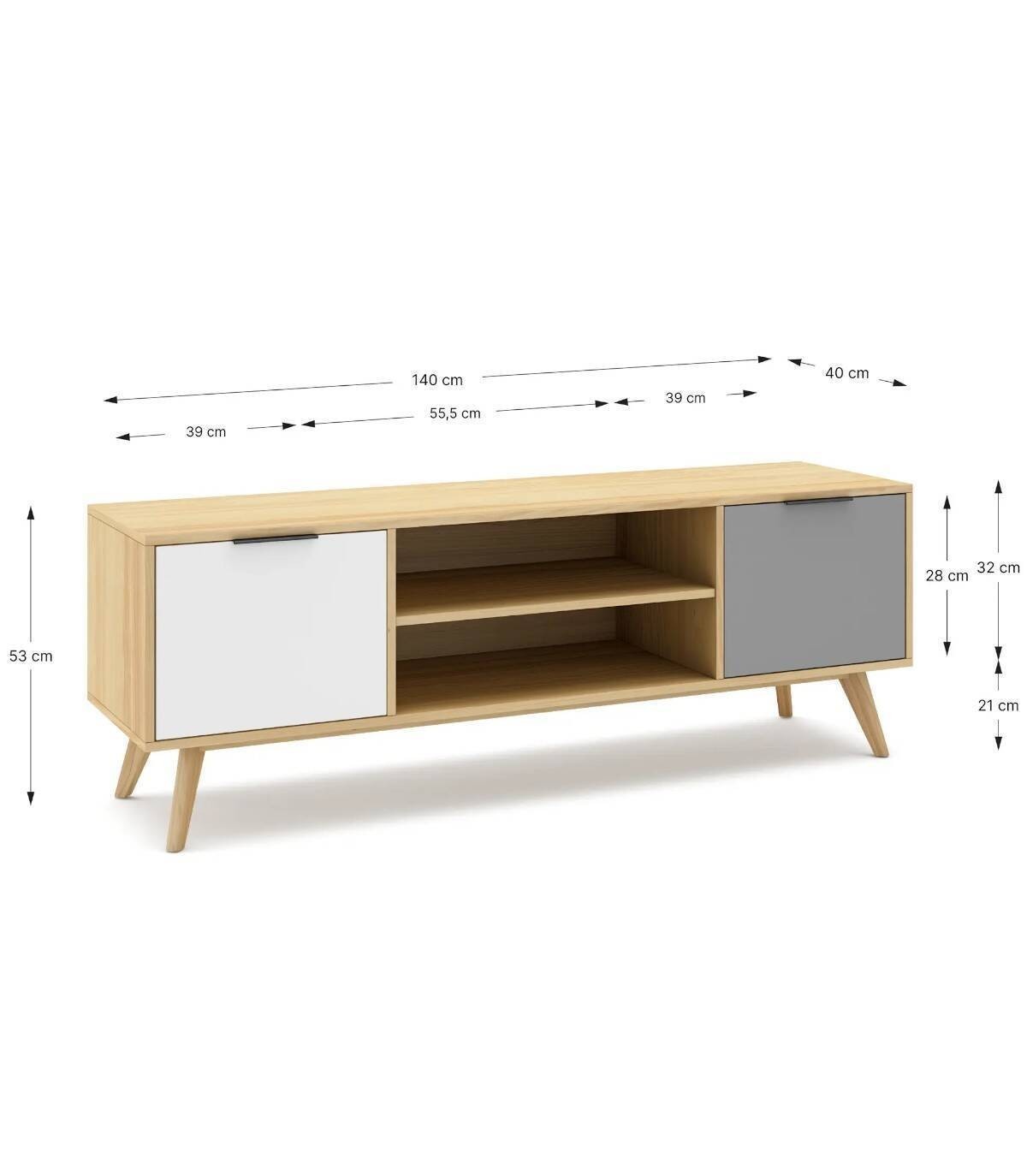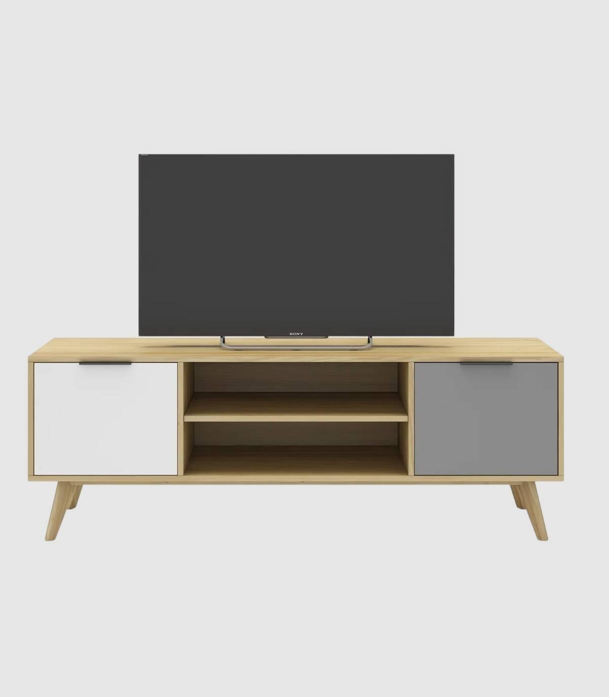 El mueble para televisores Lanuke se compone de dos puertas, una a la derecha con frontal gris, otra a la izquierda con frontal blanco, con tirador en el extremo superior y dos huecos separados por una balda en el centro, estructura y cuatro patas de pino de color madera.